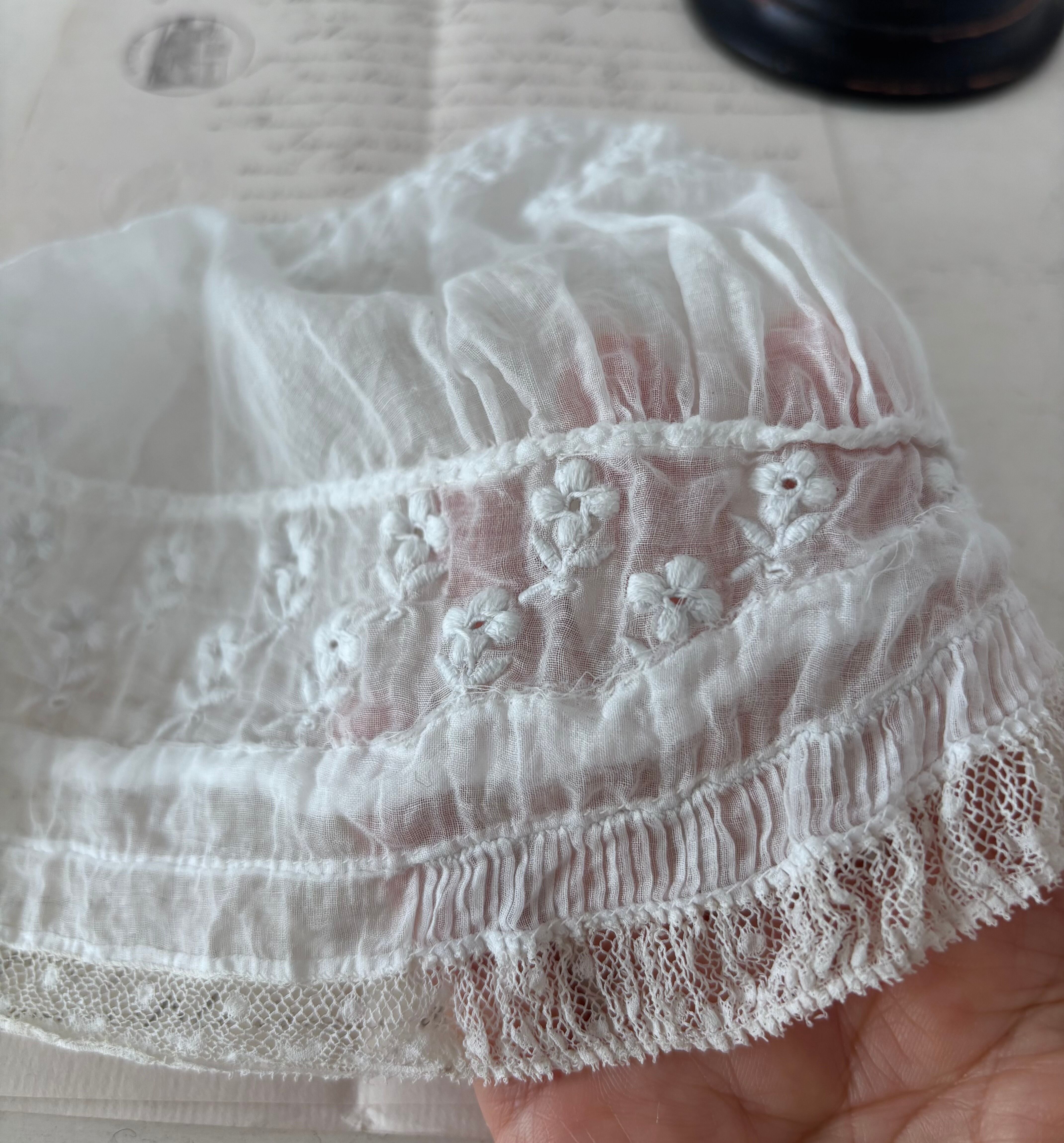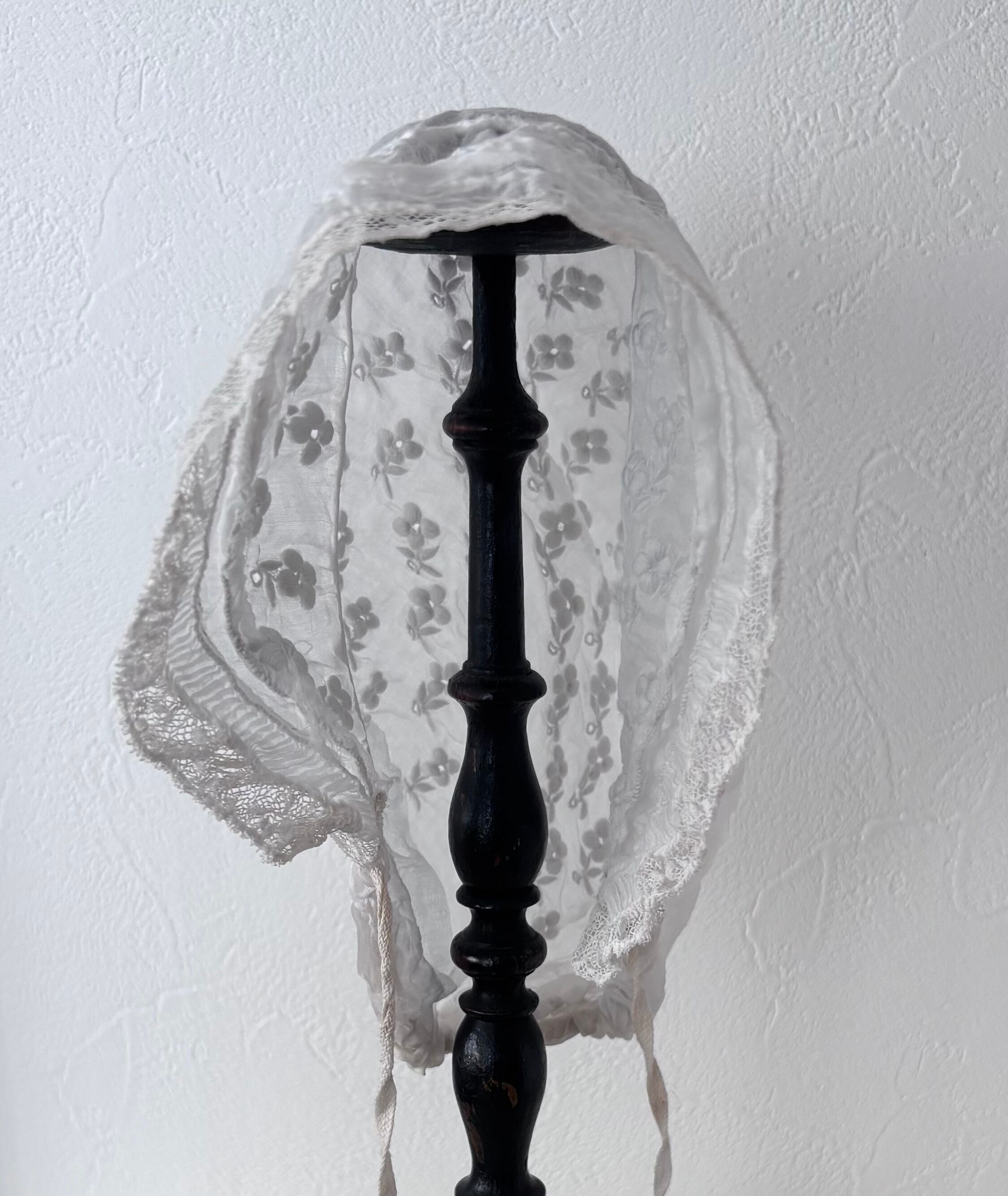 やわらかな薄手のコットン生地に小さな花の刺繍が施され、縁には繊細なレースがあしらわれています。