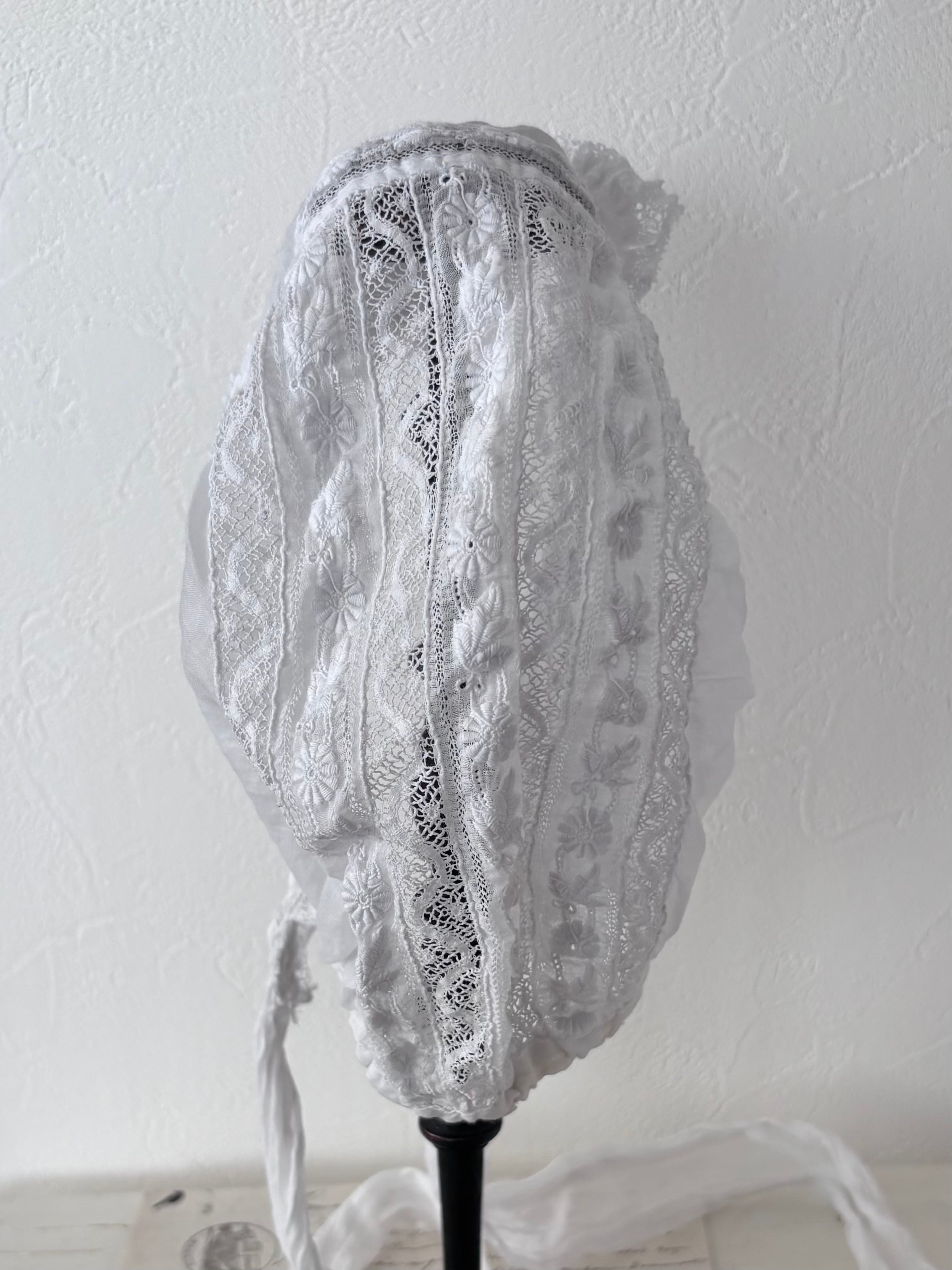 前縁にはレースのダブルフリルが施され、後ろはふんわりと丸みのあるシルエットの愛らしい形のボネです。