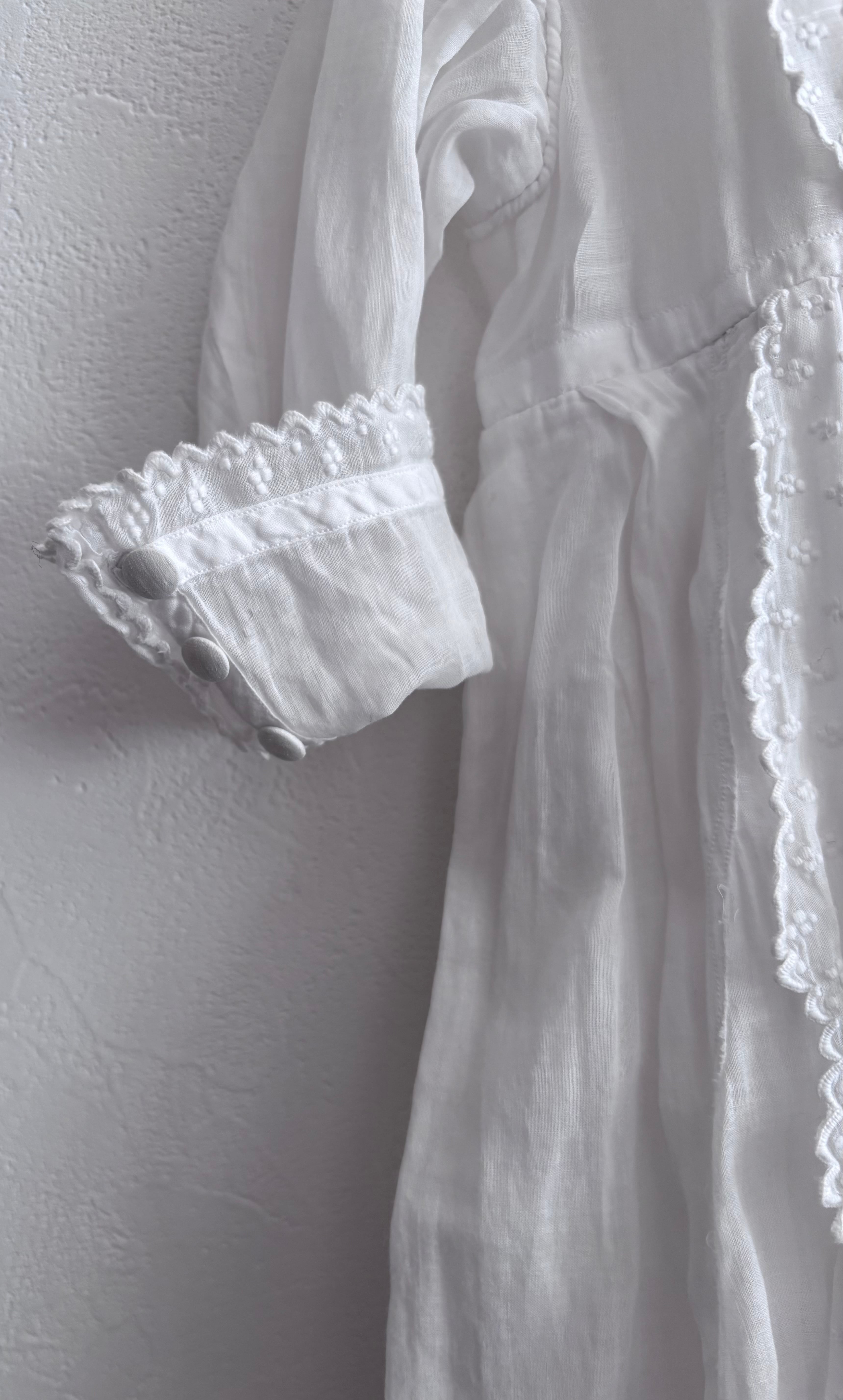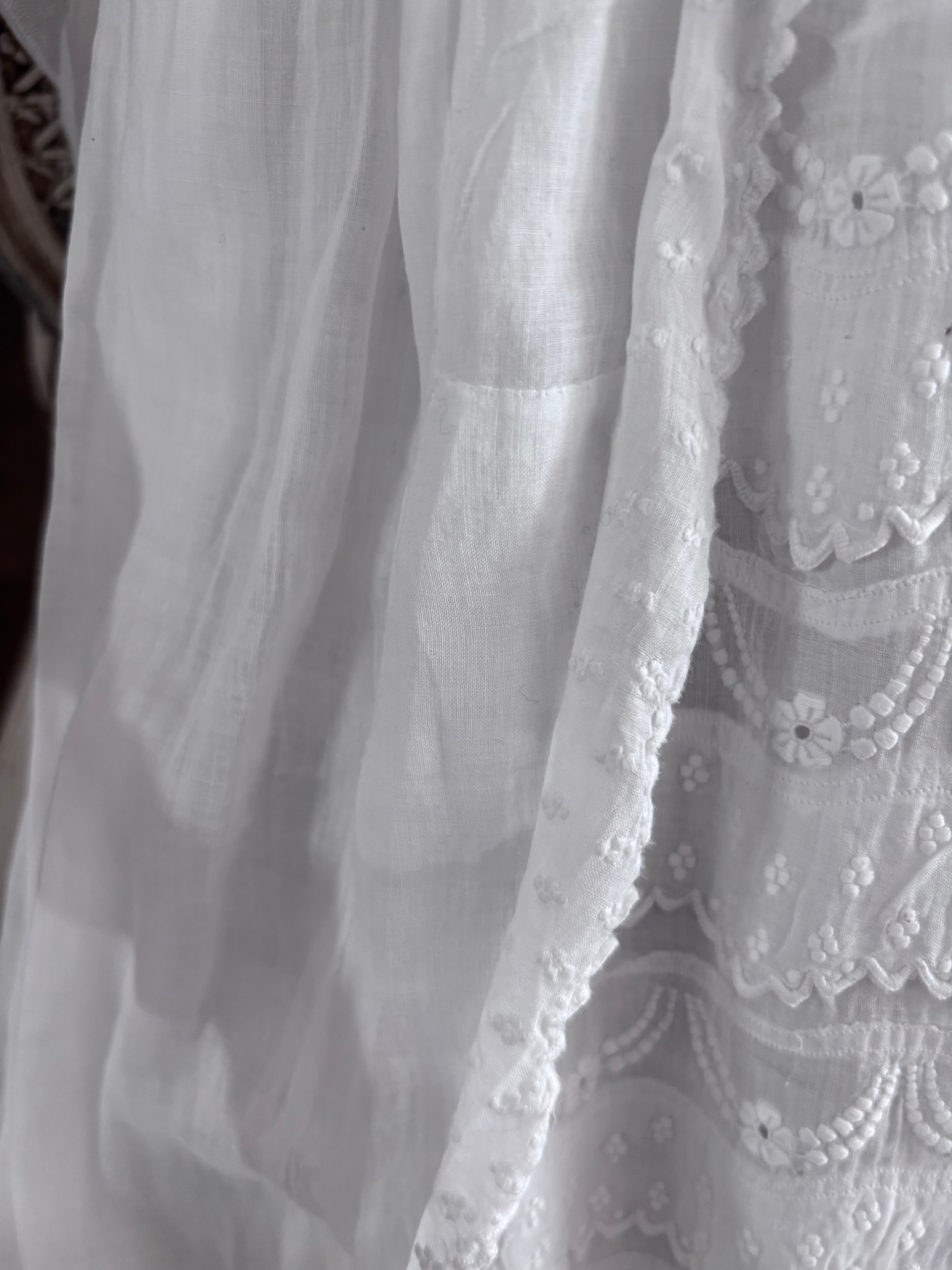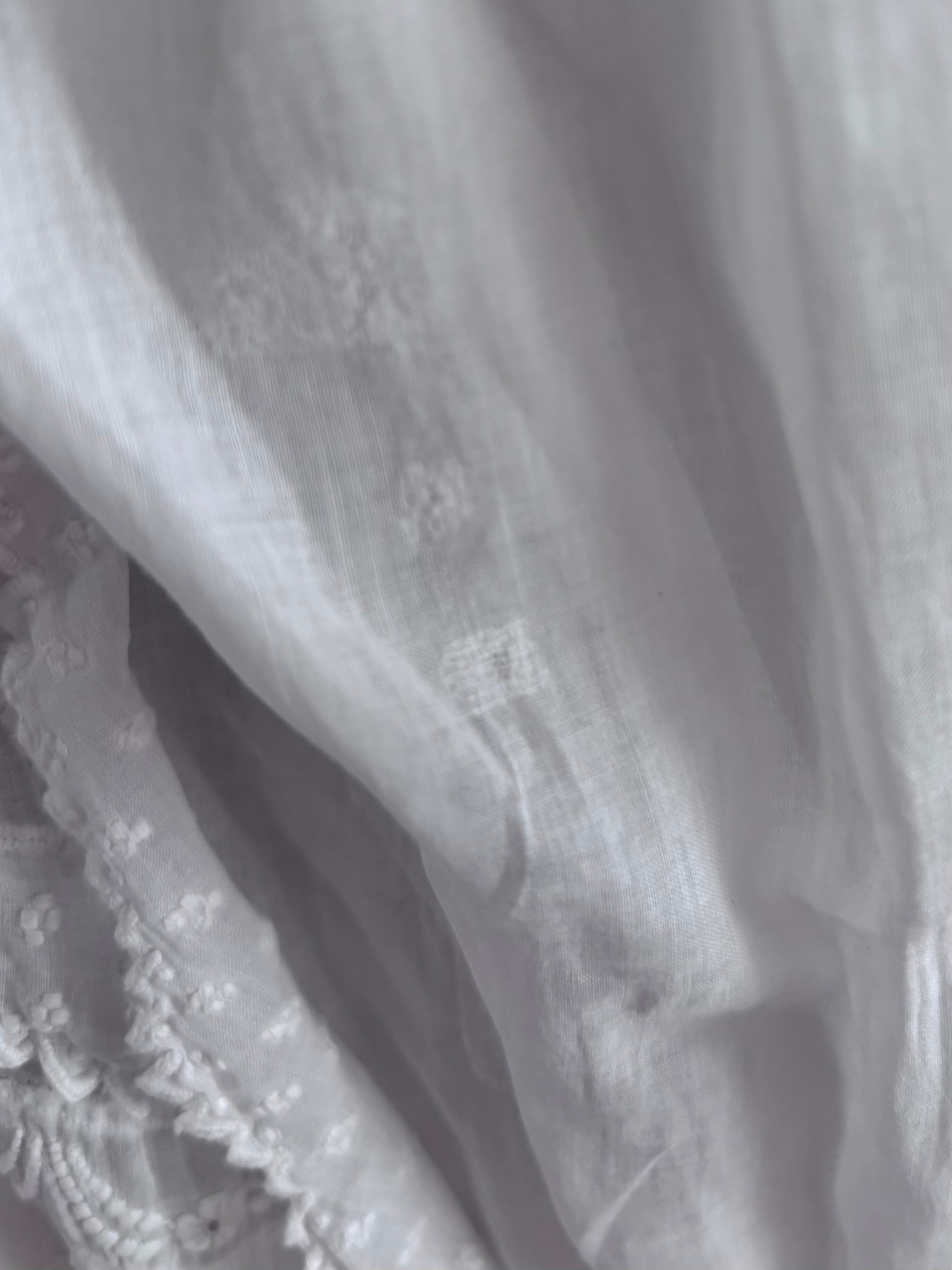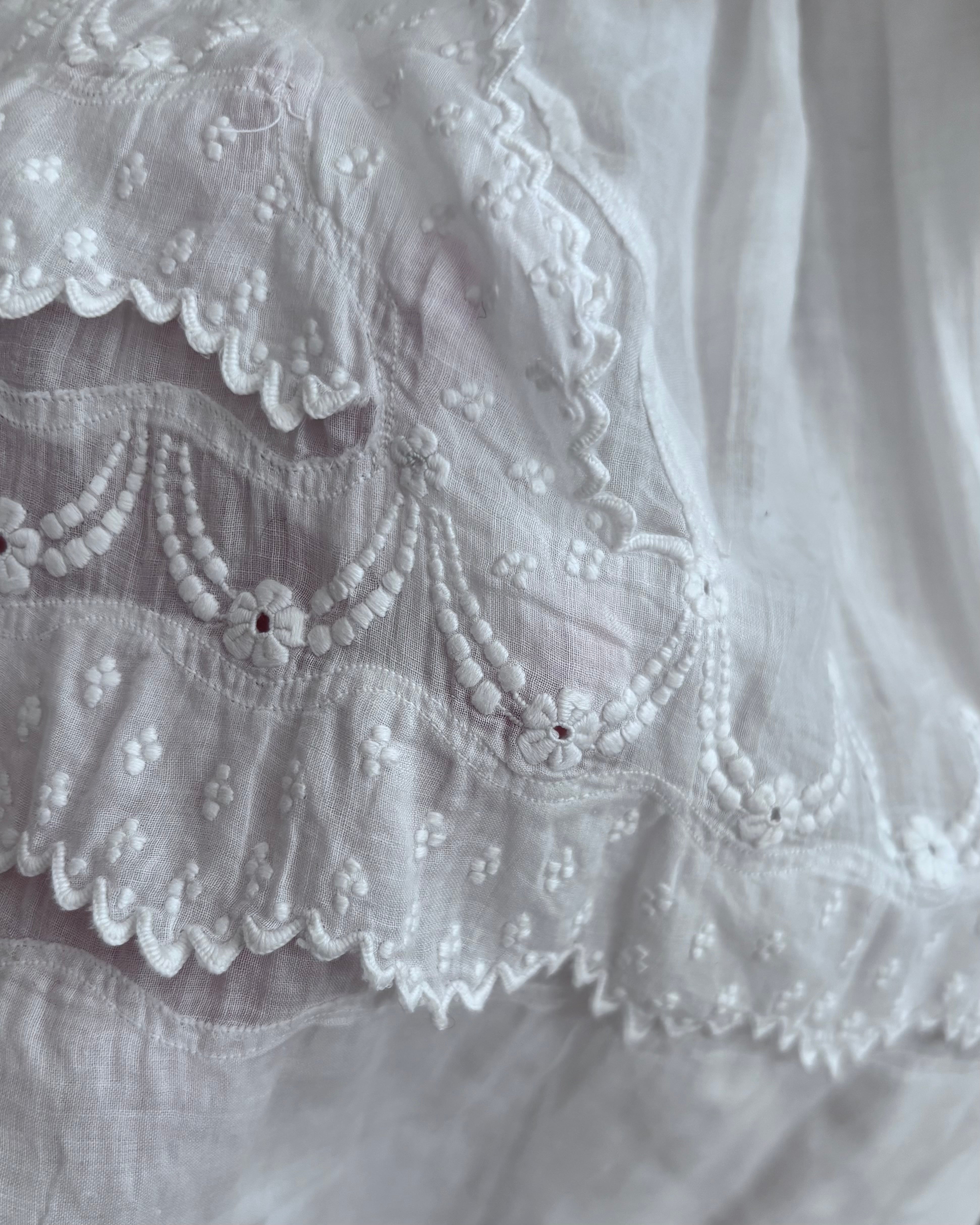やわらかな透け感のあるホワイトコットンに、繊細な刺繍が贅沢にあしらわれた、フランスの古いベビードレスです。
