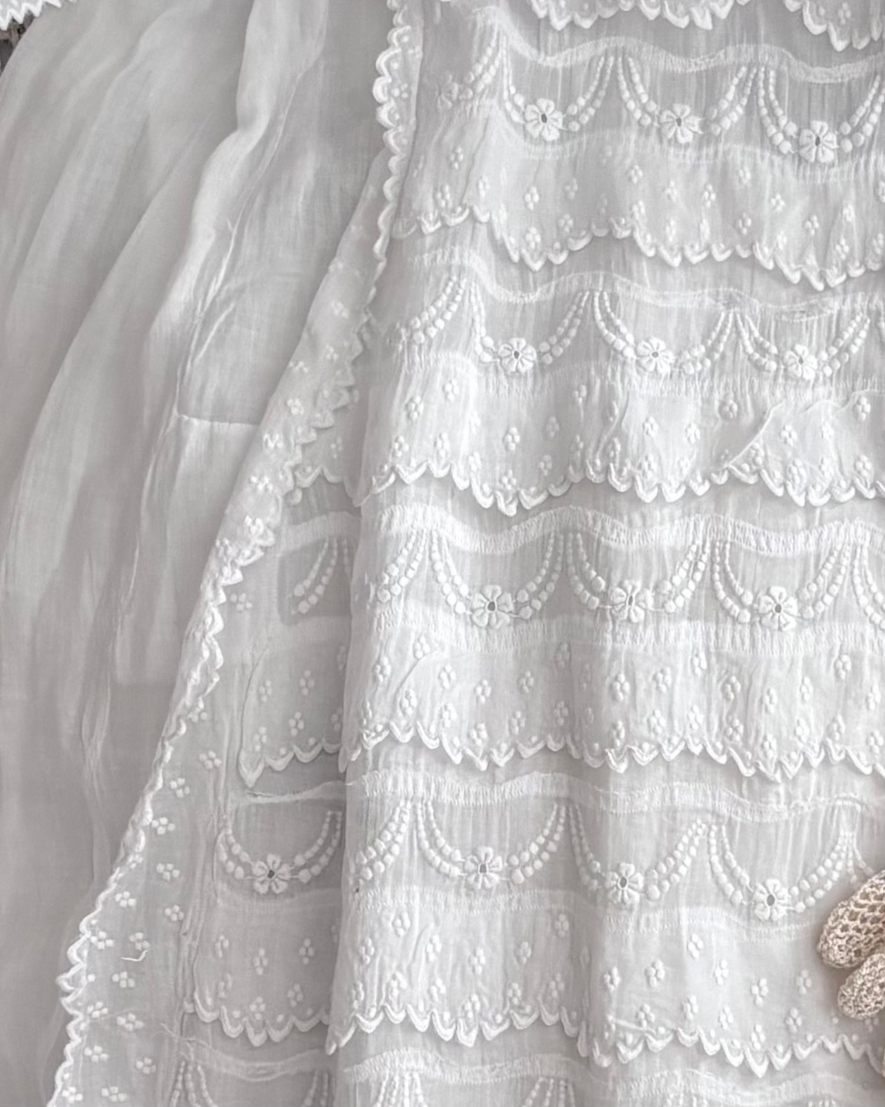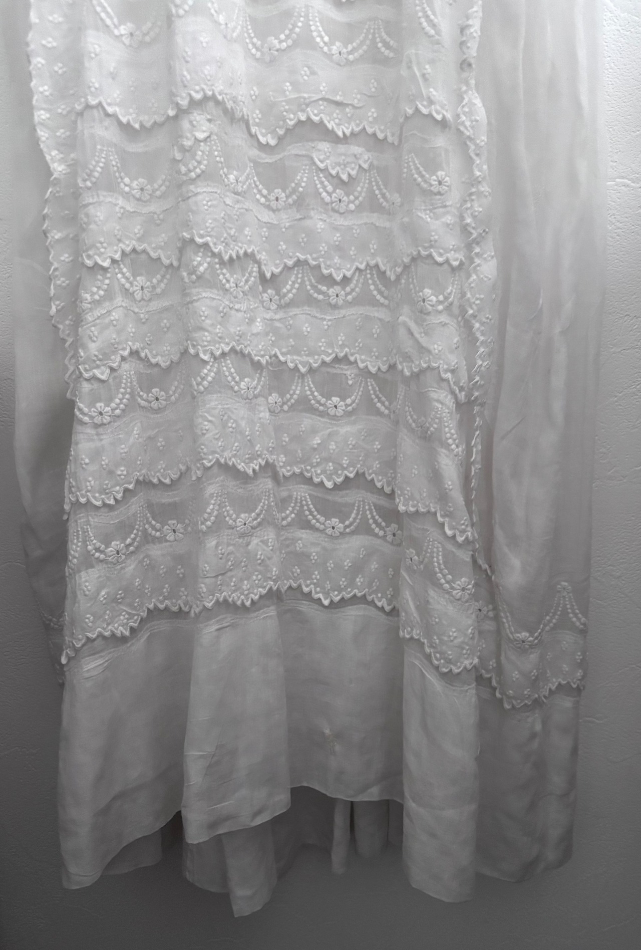胸元から裾にかけては、幾重にも重ねられた刺繍の装飾が美しく広がり、小花のモチーフやスカラップの縁取りがリズミカルに連なります。