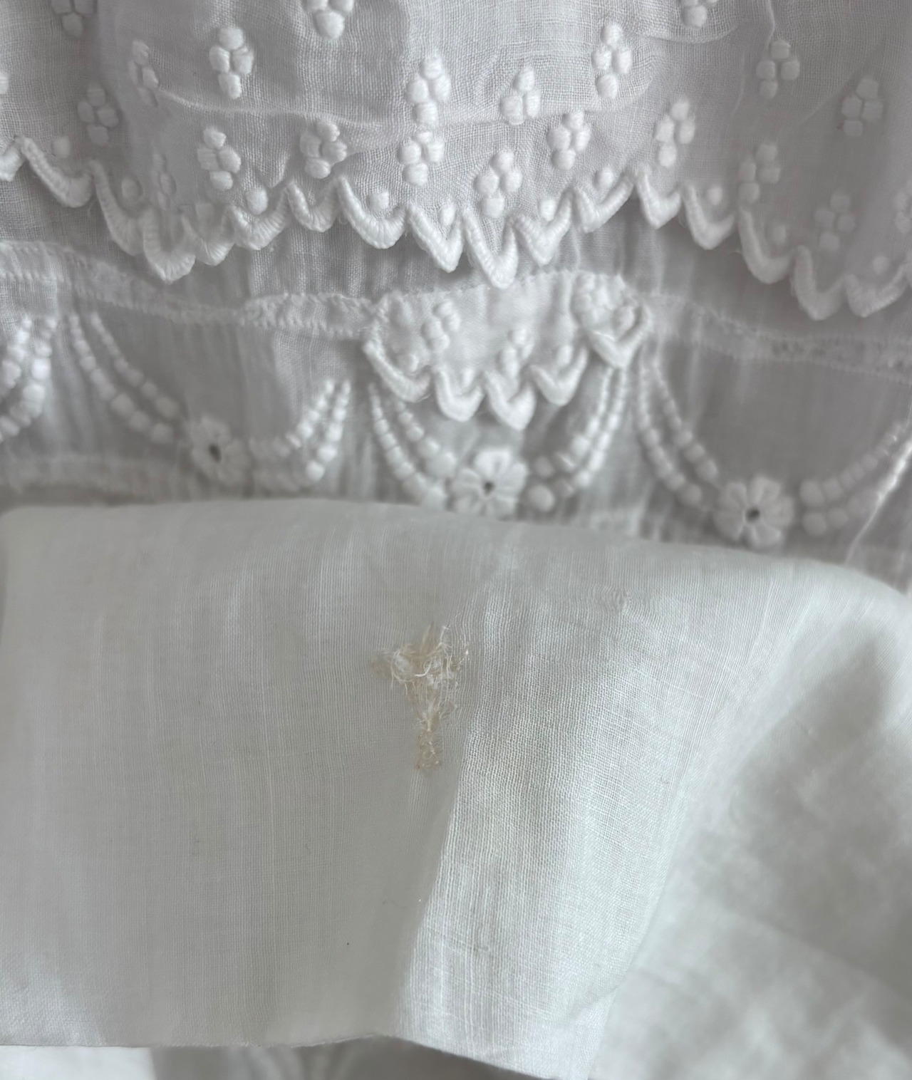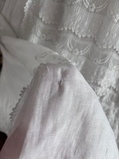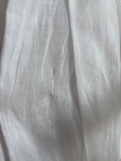 一見すると美しい状態を保っていますが、薄く繊細な生地のため、小さなスポット状のシミとホール、補修跡(写真5・6拡大)が見られます。(写真5〜10参照、他薄いシミや小さなホールあり)