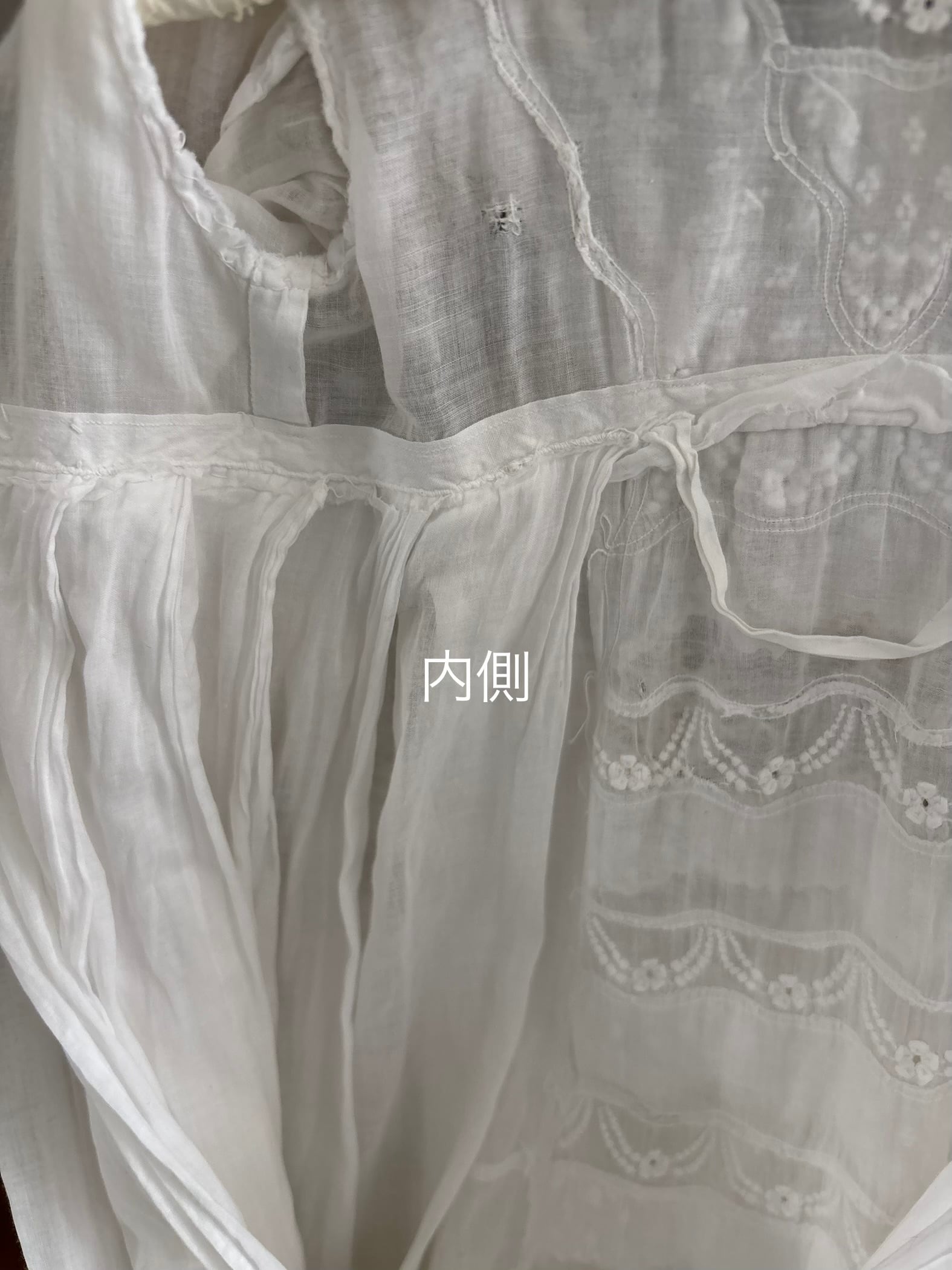 マシーン縫製ながらも、一部手作業の跡が見られる、当時の仕立て過渡期ならではのべべ(ベビー)ドレス。