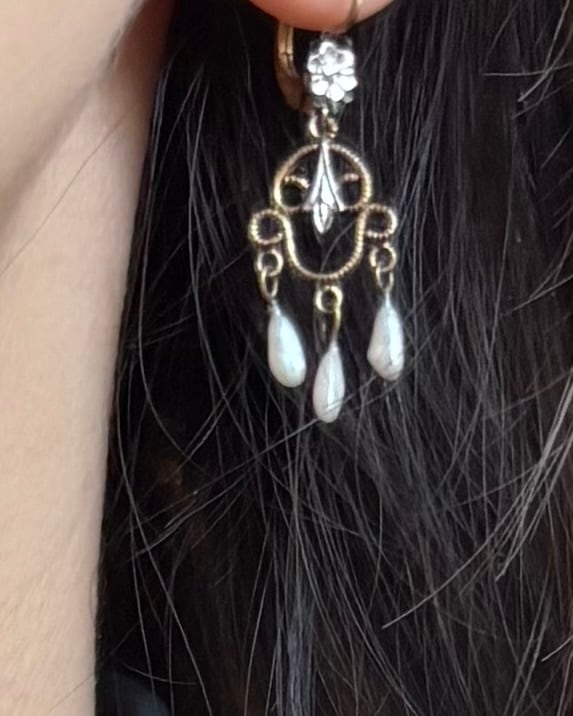金属部分はメッキを施したベースメタル、揺れる装飾にはガラスパールが用いられています。