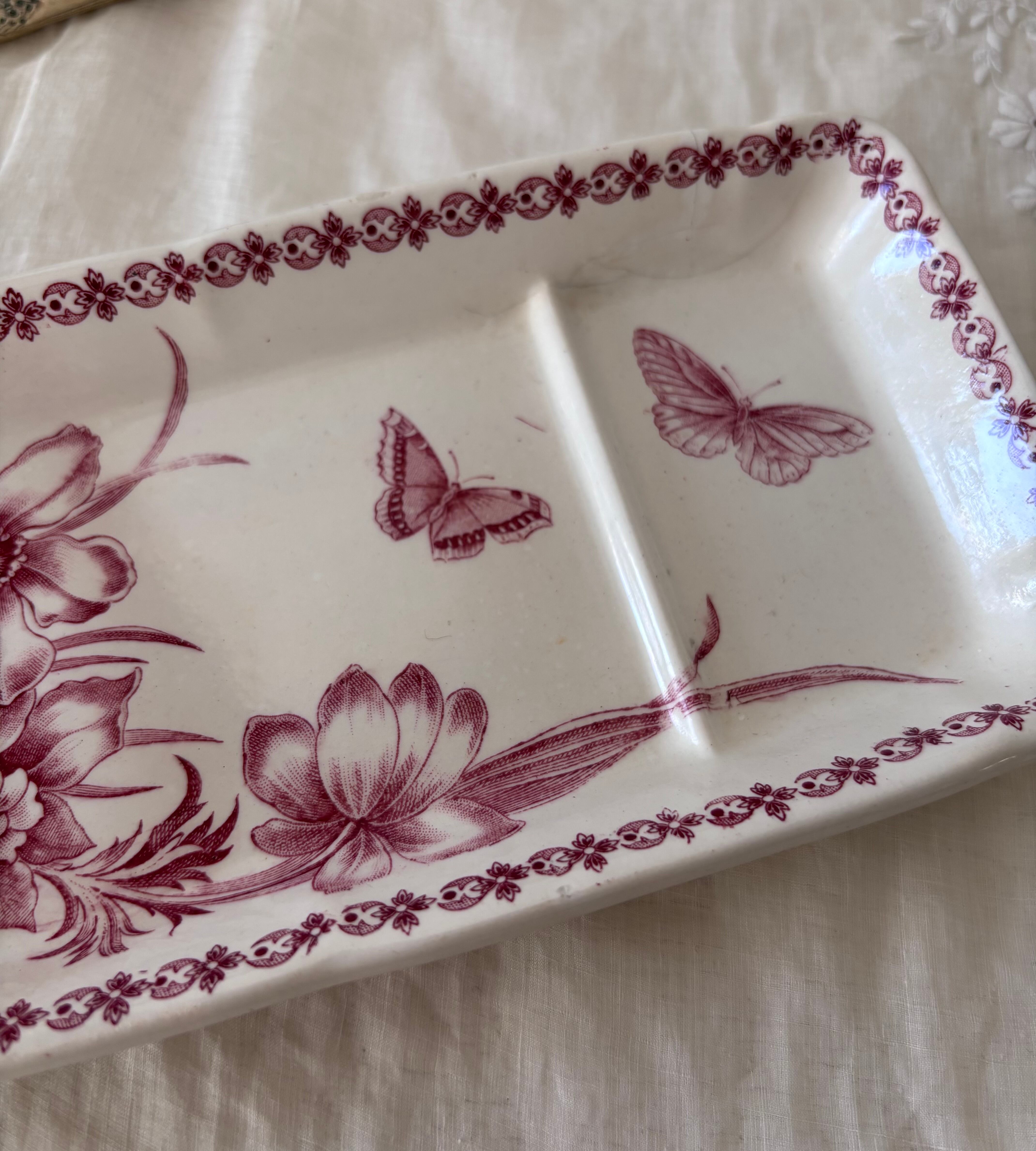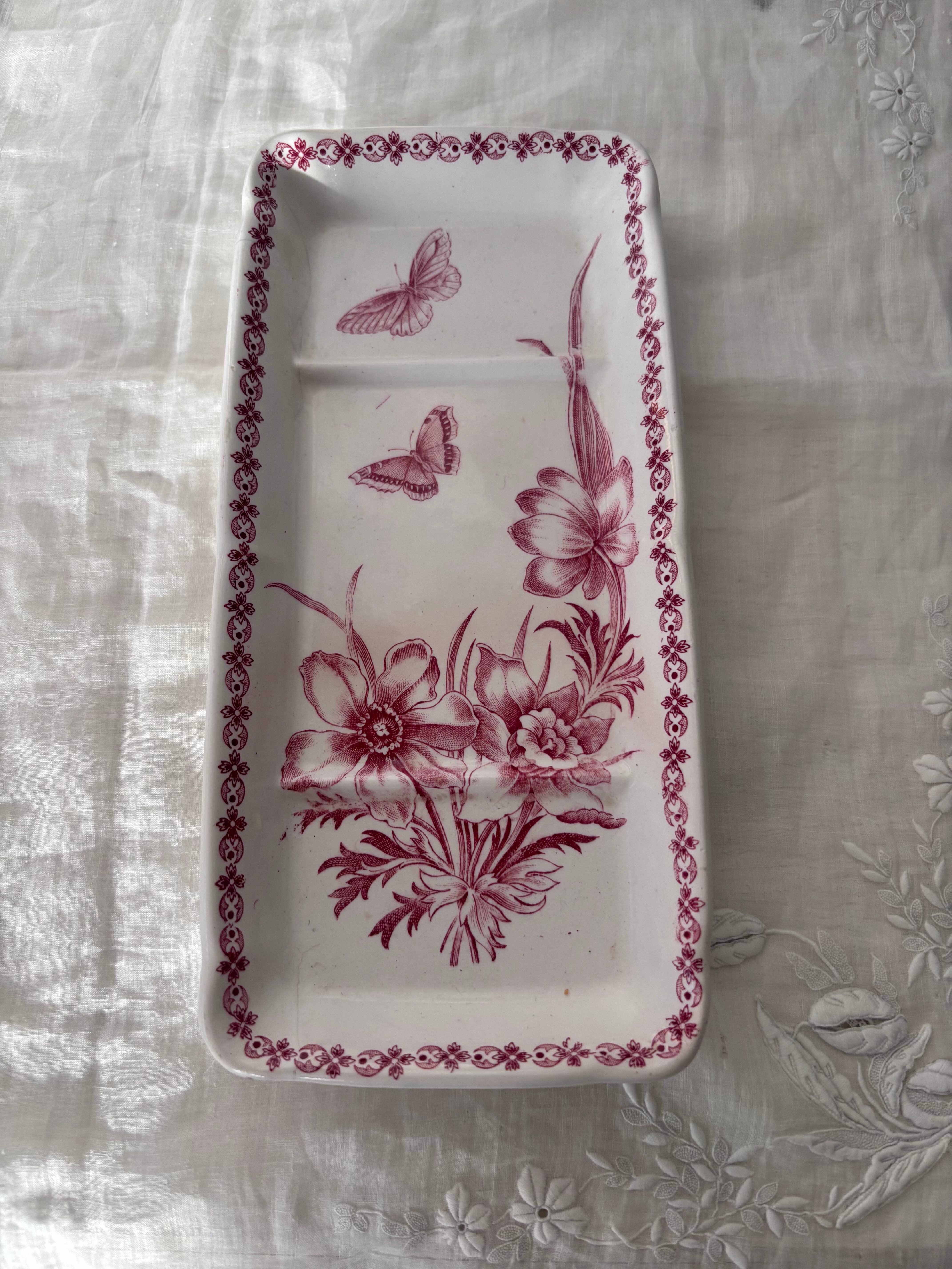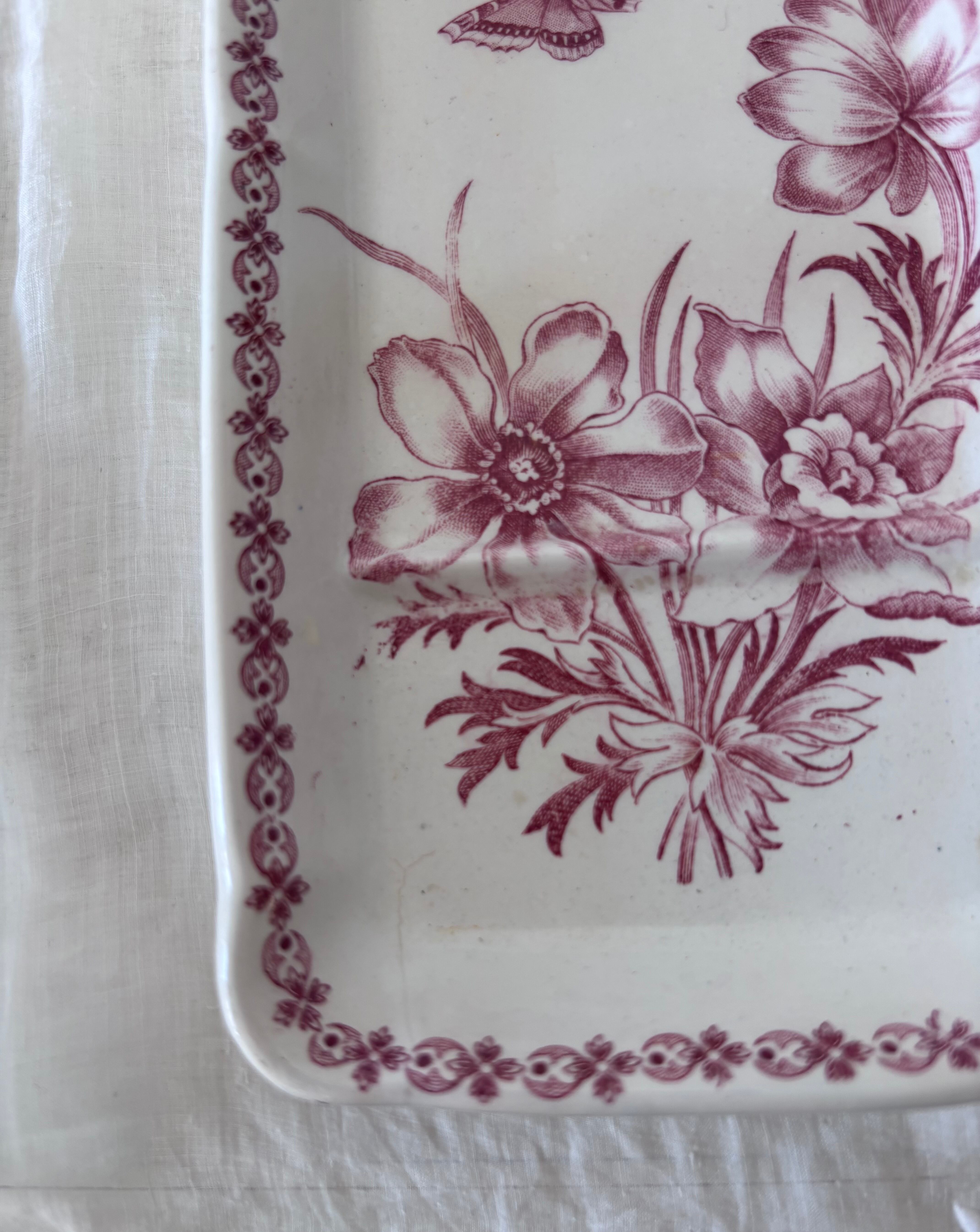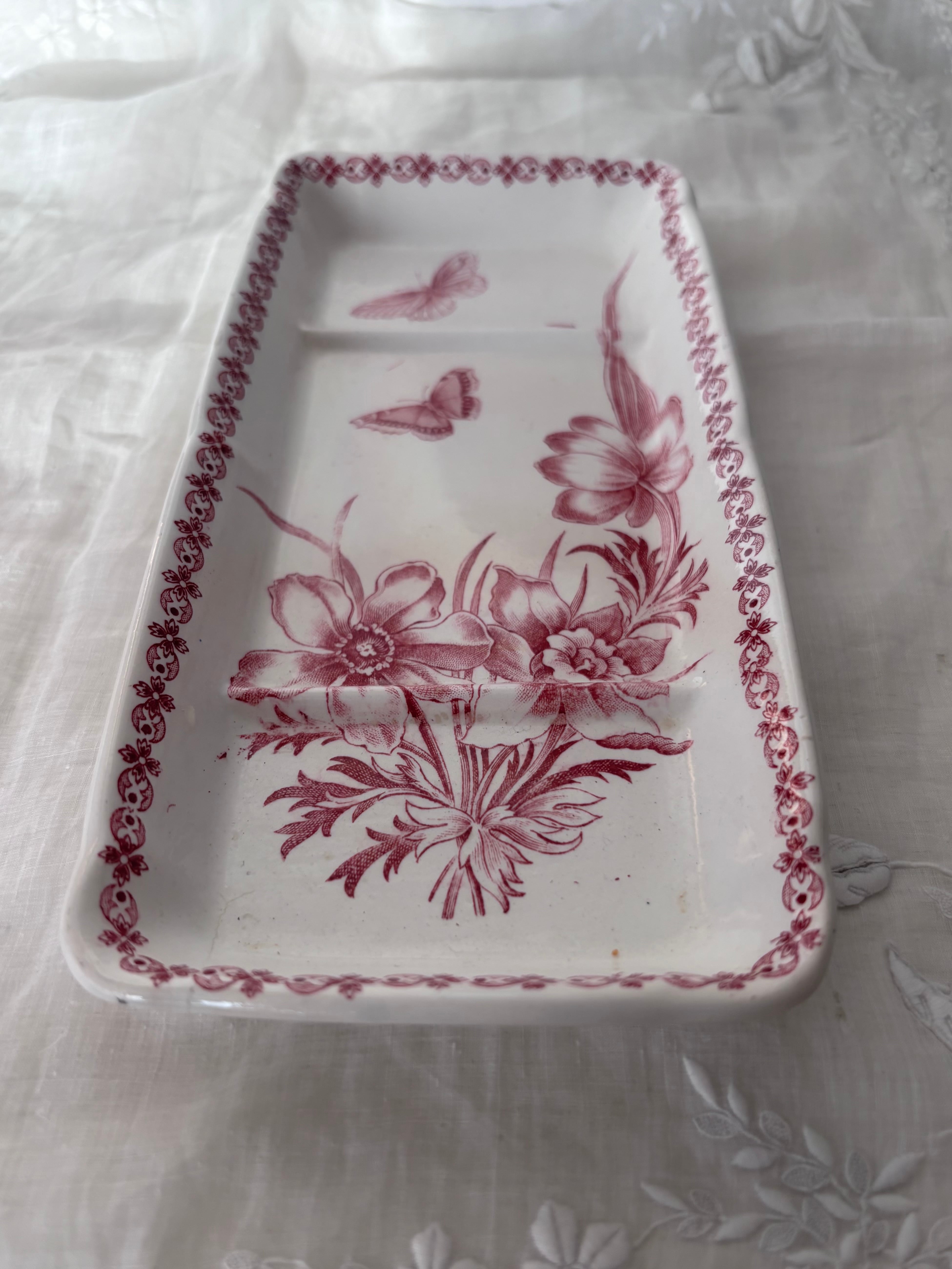 やわらかな赤のトーンで描かれた、花と蝶のモチーフが印象的な長方形プレートです。