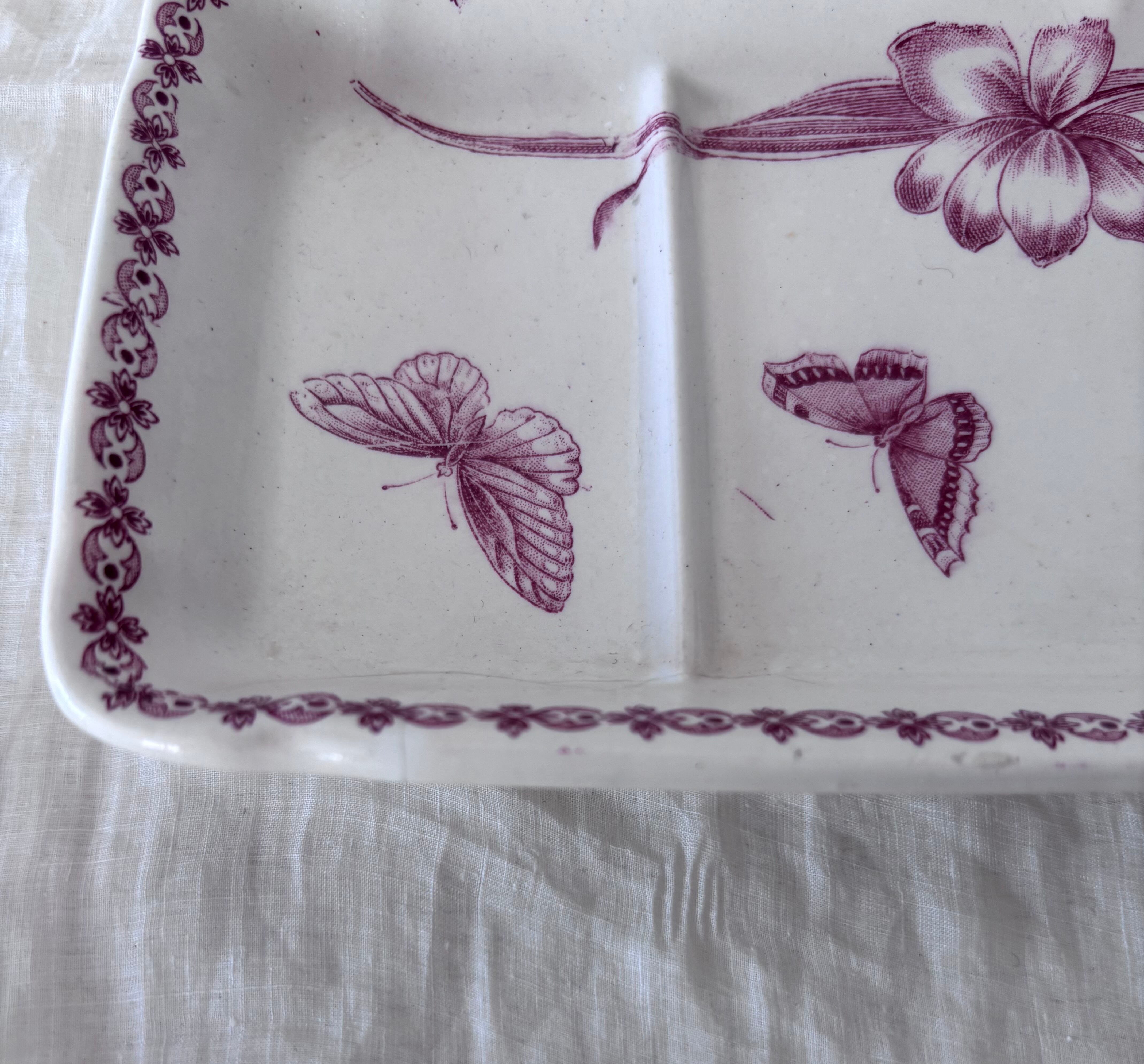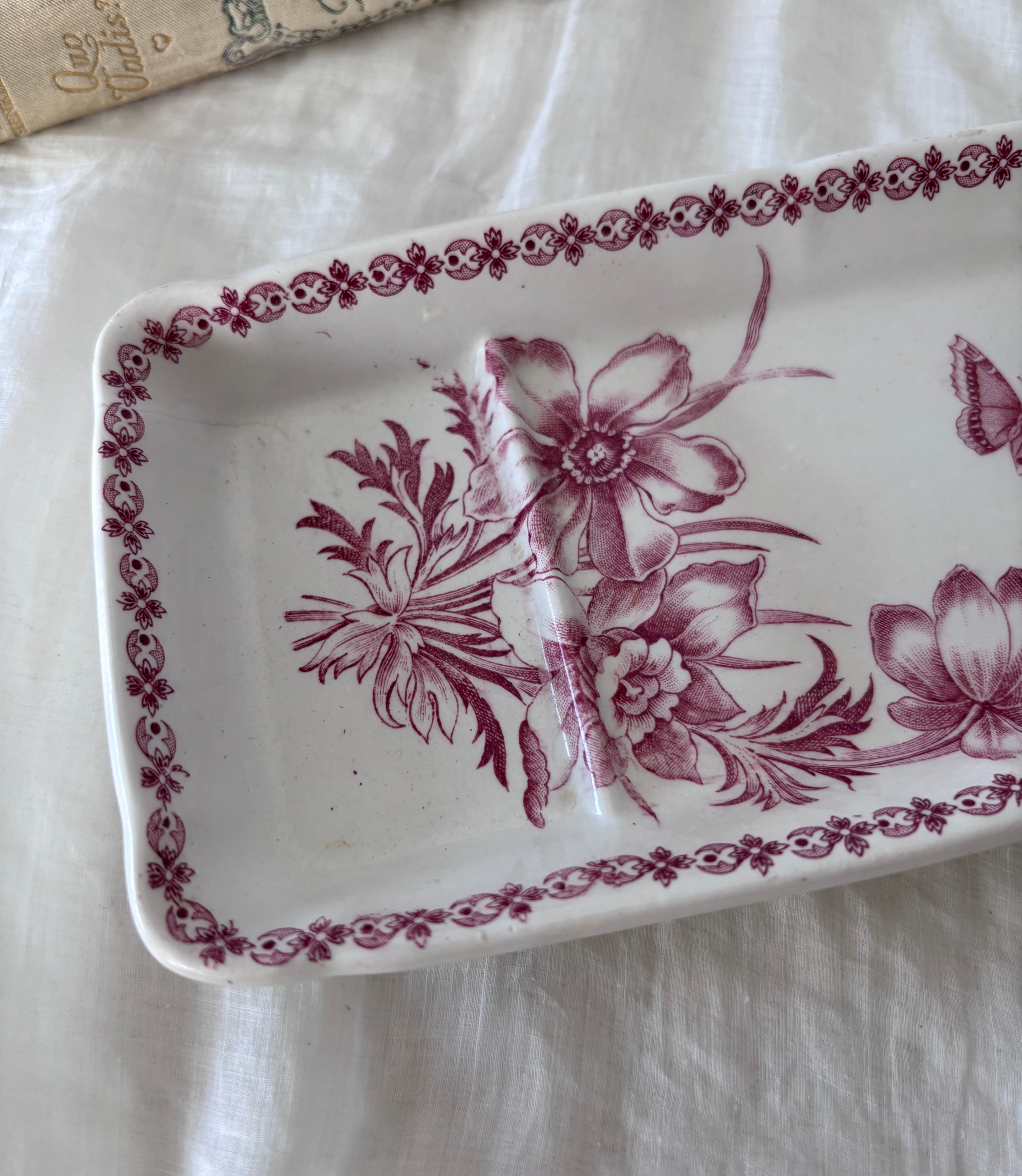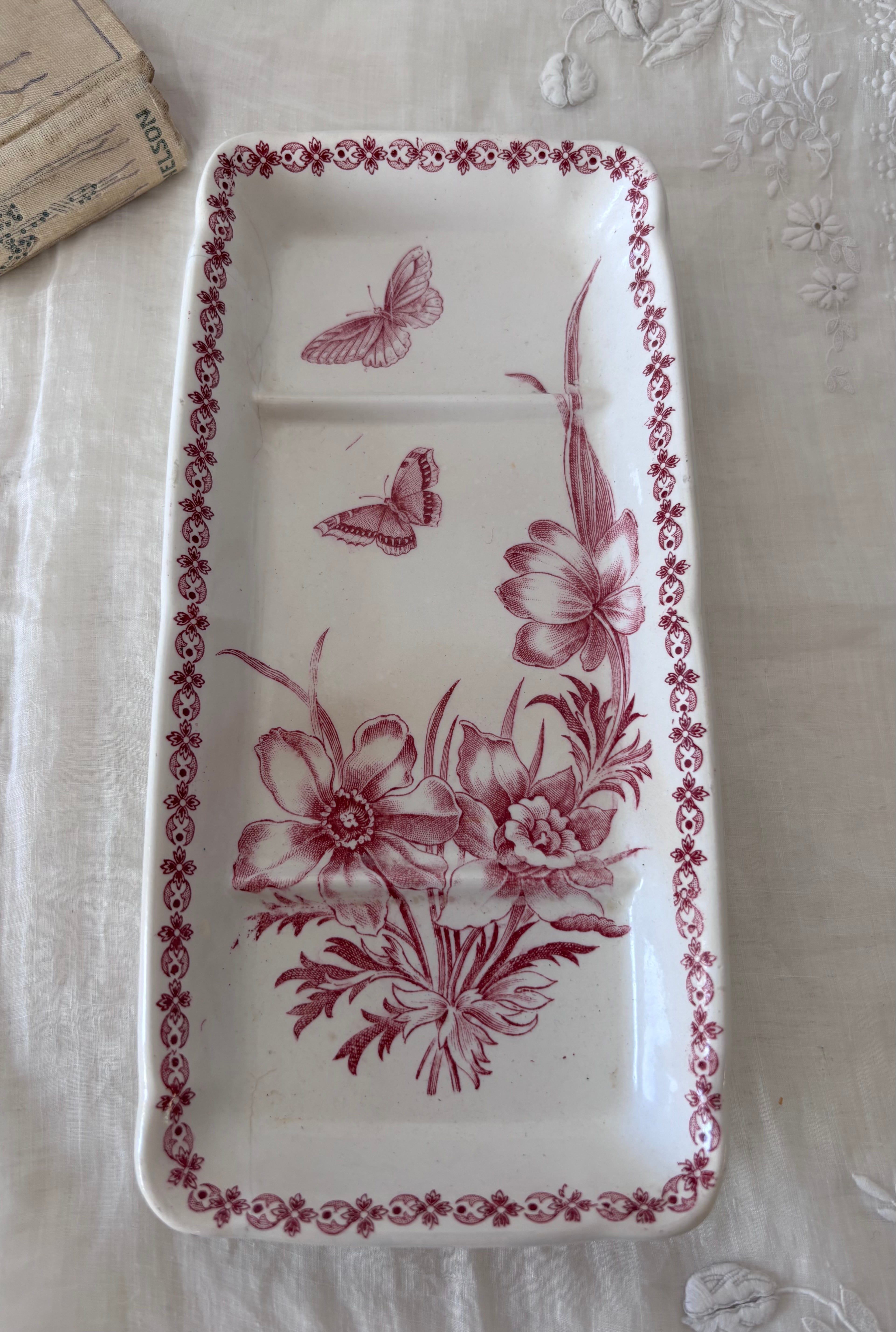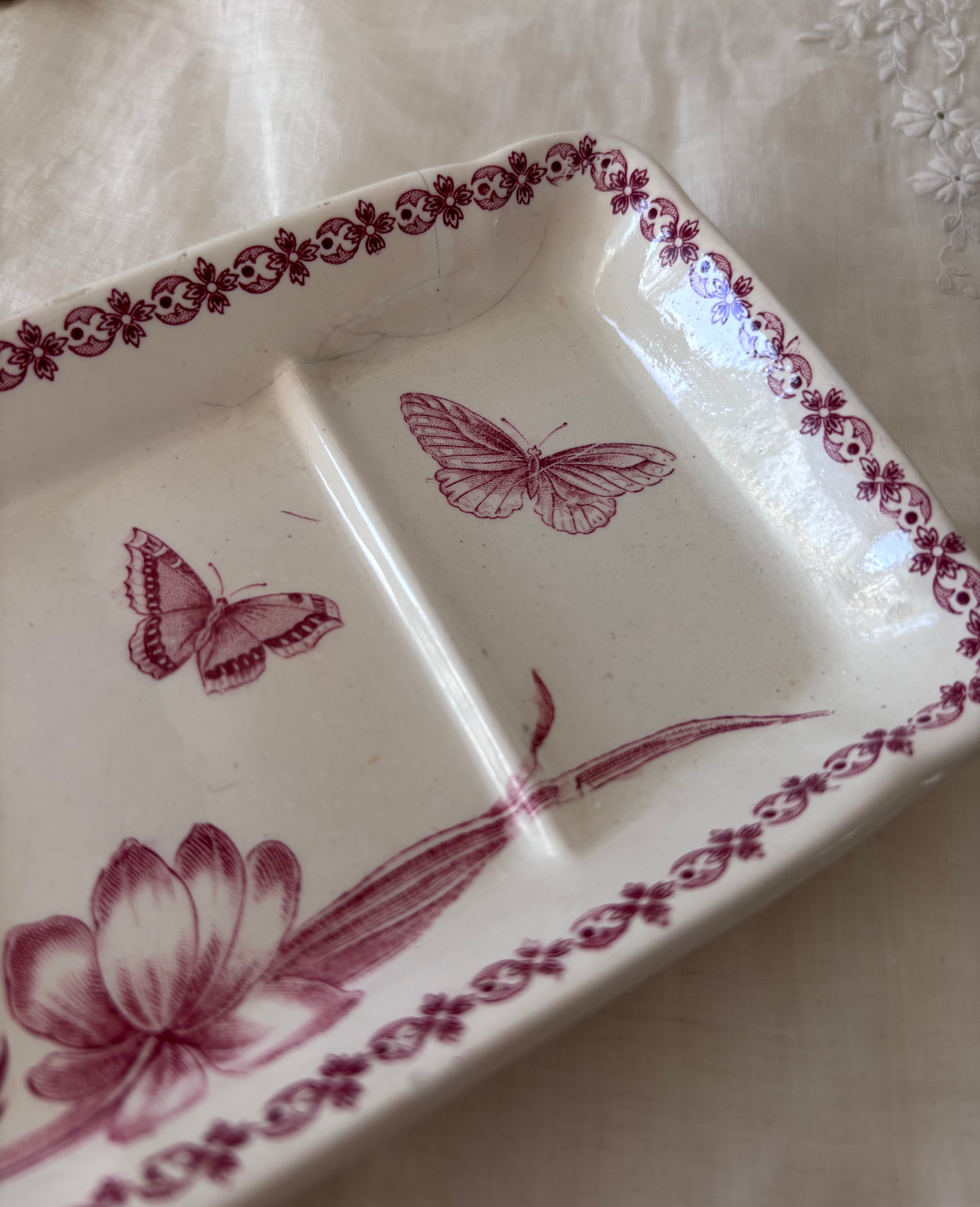 やわらかな赤のトーンで描かれた、花と蝶のモチーフが印象的な長方形プレートです。
