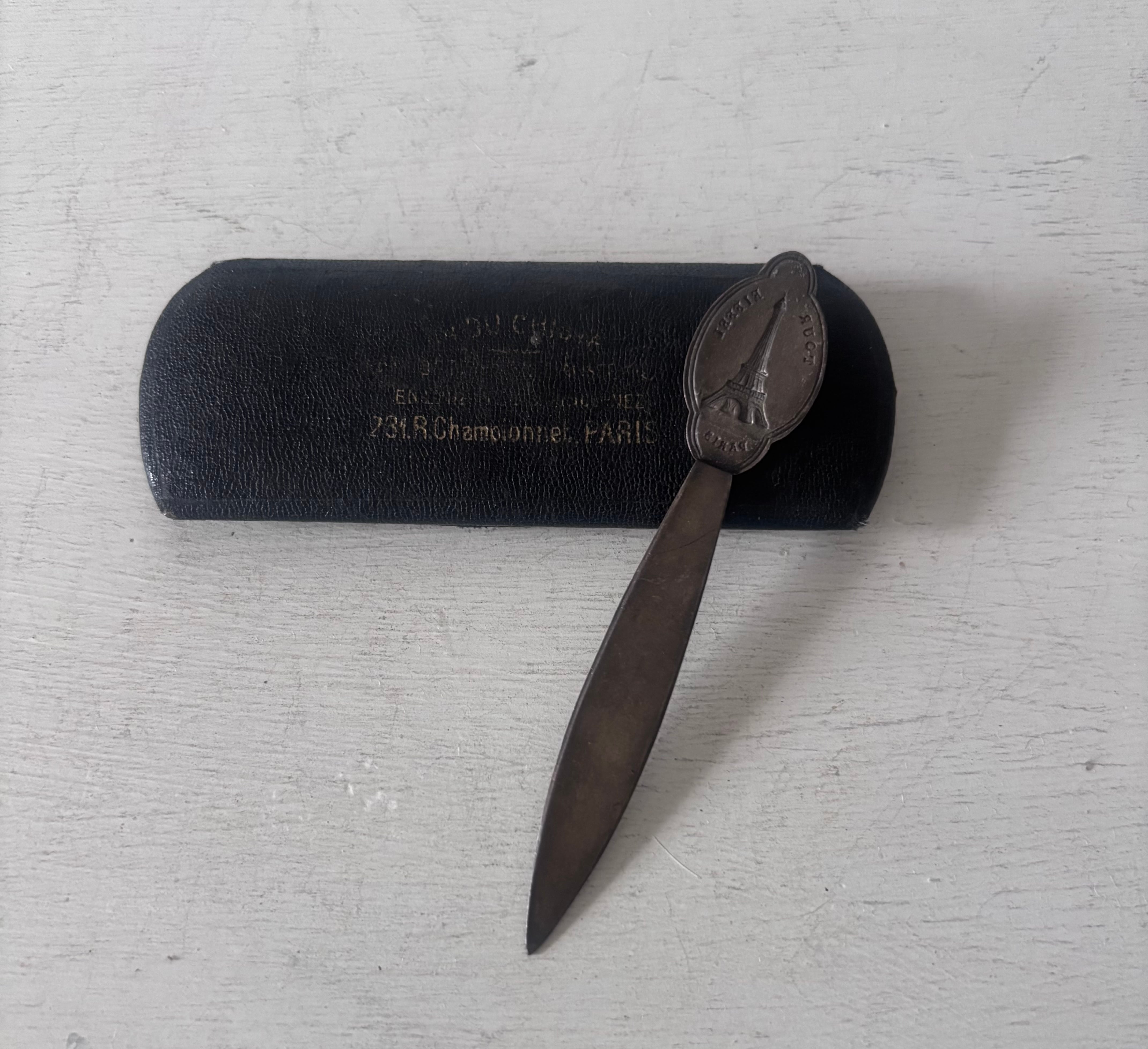 写真のケースともにアミアンで見つけたもので、オリジナルの組み合わせではありませんが、どちらにもParisの文字が見られ、レターオープナーがきれいに収まるサイズ感です。(中に収納した写真では、文字がケースの底面側になります)