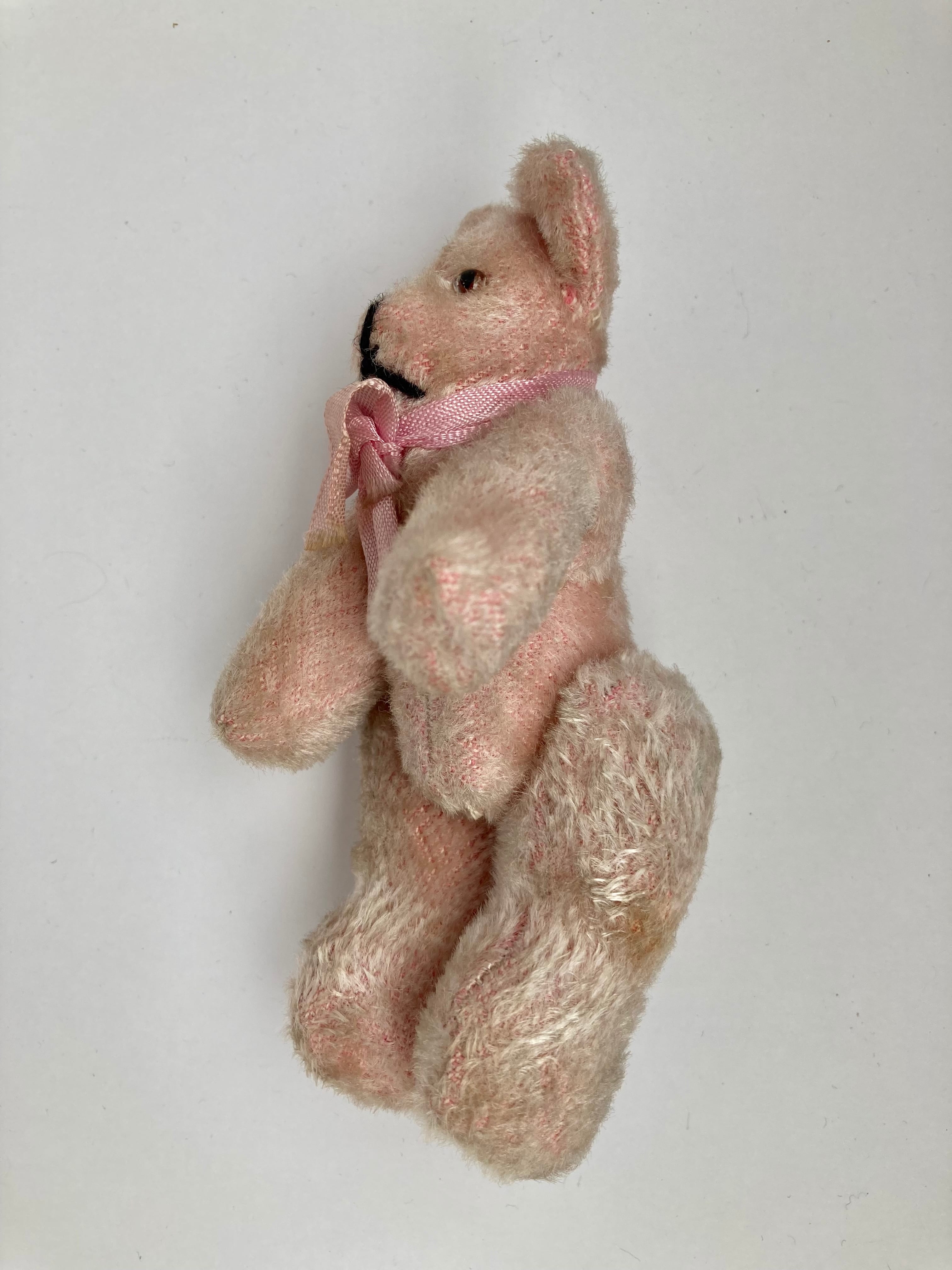 グラスアイ、ジョイント手足、中身は羊毛のようです。古いものですので、手足の動きが固くモヘアは汚れや所々薄くなっているところがあります。