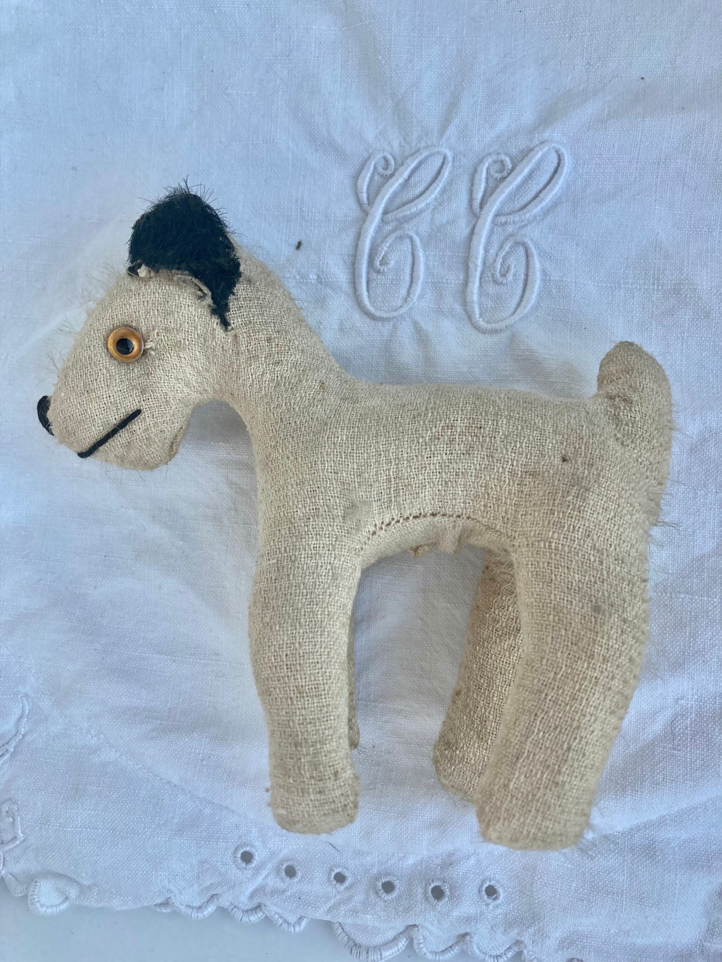 とても古い犬のぬいぐるみです。古いプラスチックアイ、詰め物は木屑で体の表面には麻の素材特有の毛羽立ちがあります。古いものですので薄っすら汚れはありますが大きなダメージは見当たりません。