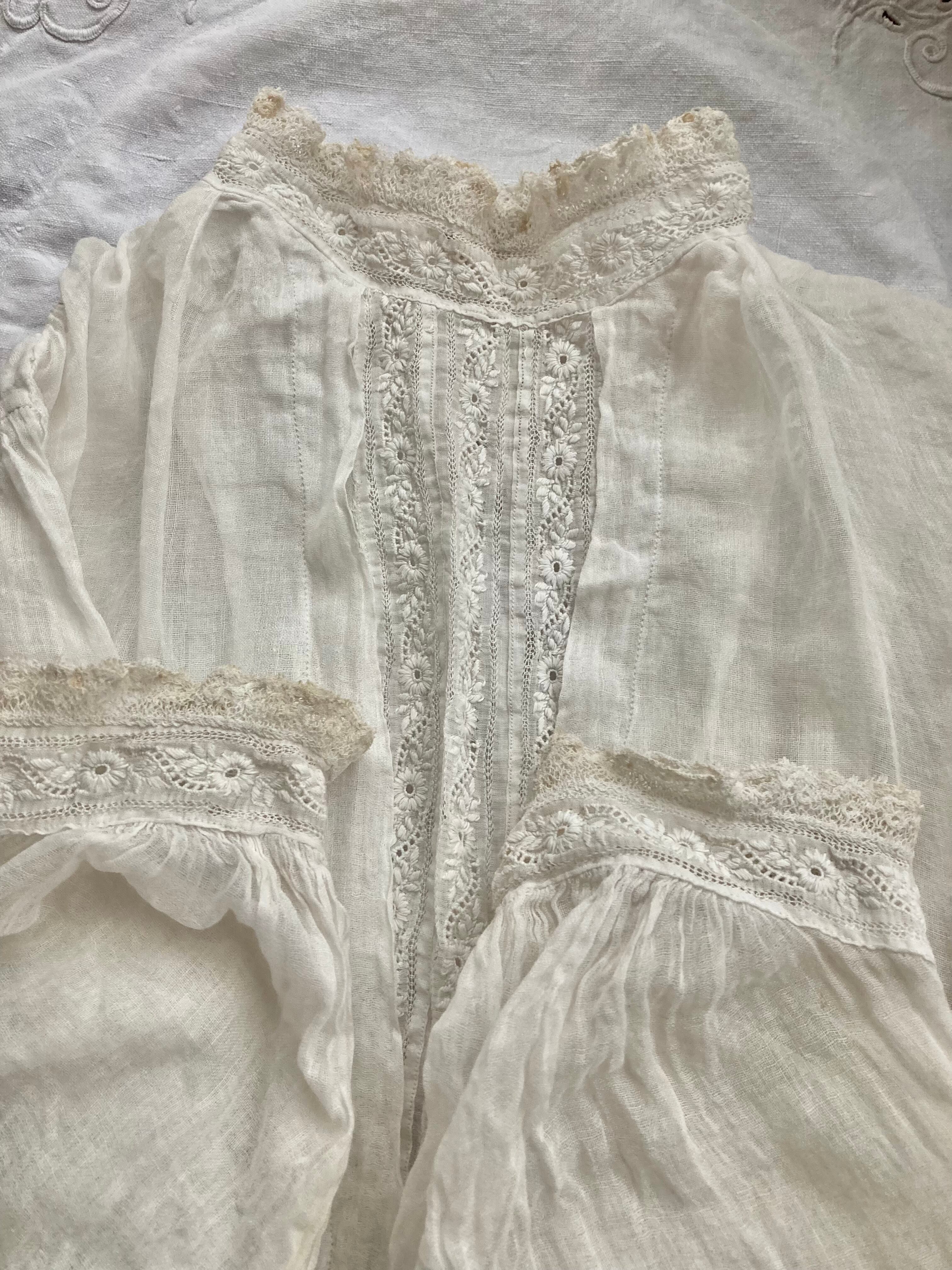 二重のレースで袖口と首元をトリミングされたアンファン(子供用)のアンティークブラウス。