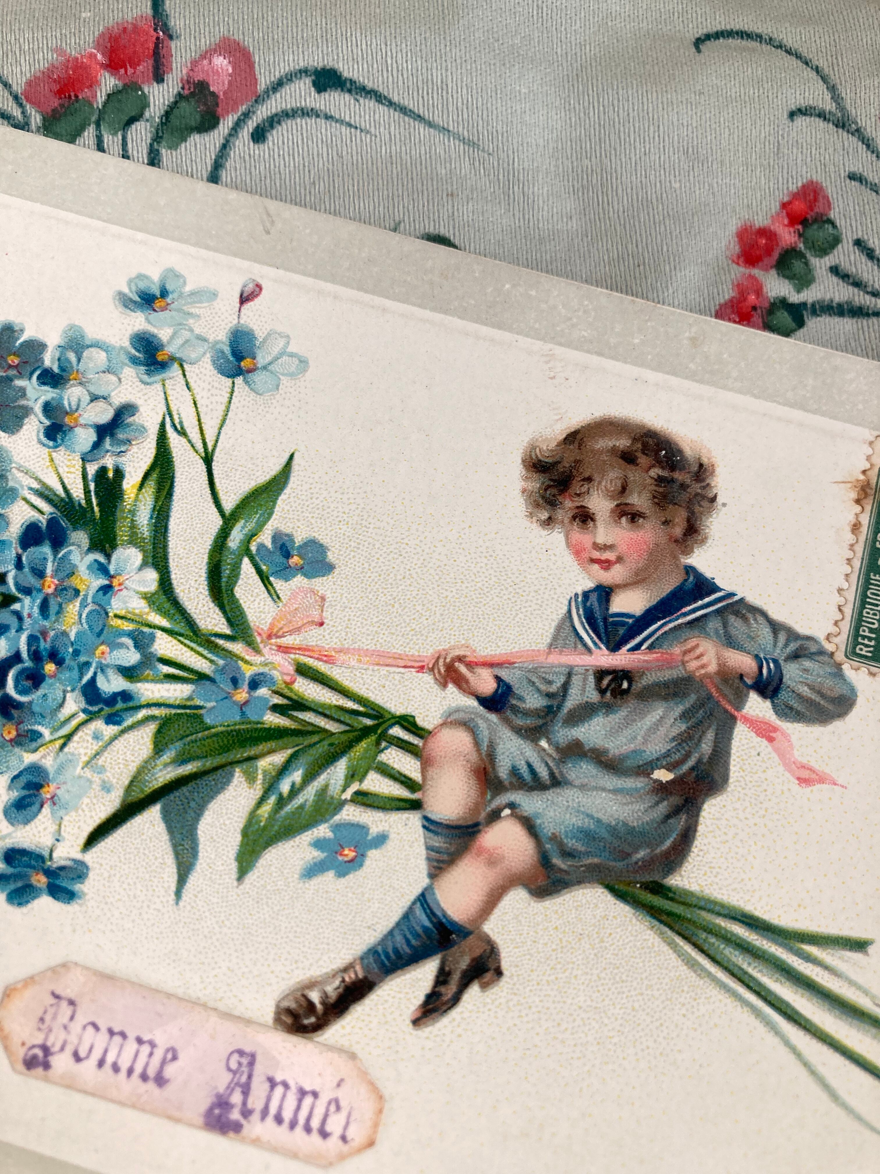 可愛い男の子のアンティークポストカード付きです。カードには変色(特に裏面)あります。