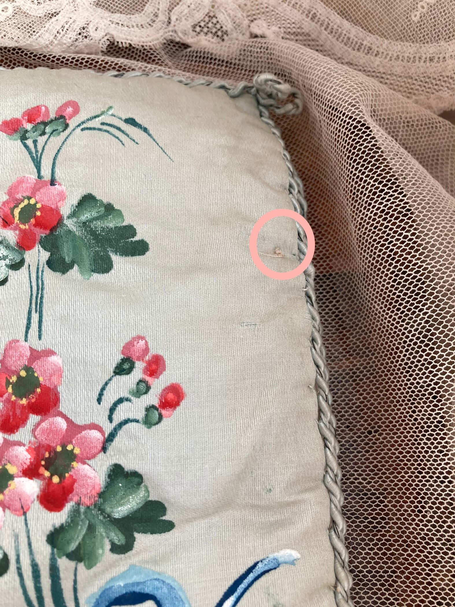 ハンカチを収納するためのシルク製のケースでその昔ご婦人が旅行する時などに使われていたようです。周りを縁取るシルクのトリムも素敵です。くるみボタンは止め付けが緩くなっています。経年による汚れ、小さな破れやインクのハネがありますが、古いものとしては中も綺麗で良い状態です。厚みもあまり無く比較的コンパクトで使いやすいサイズだと思います。