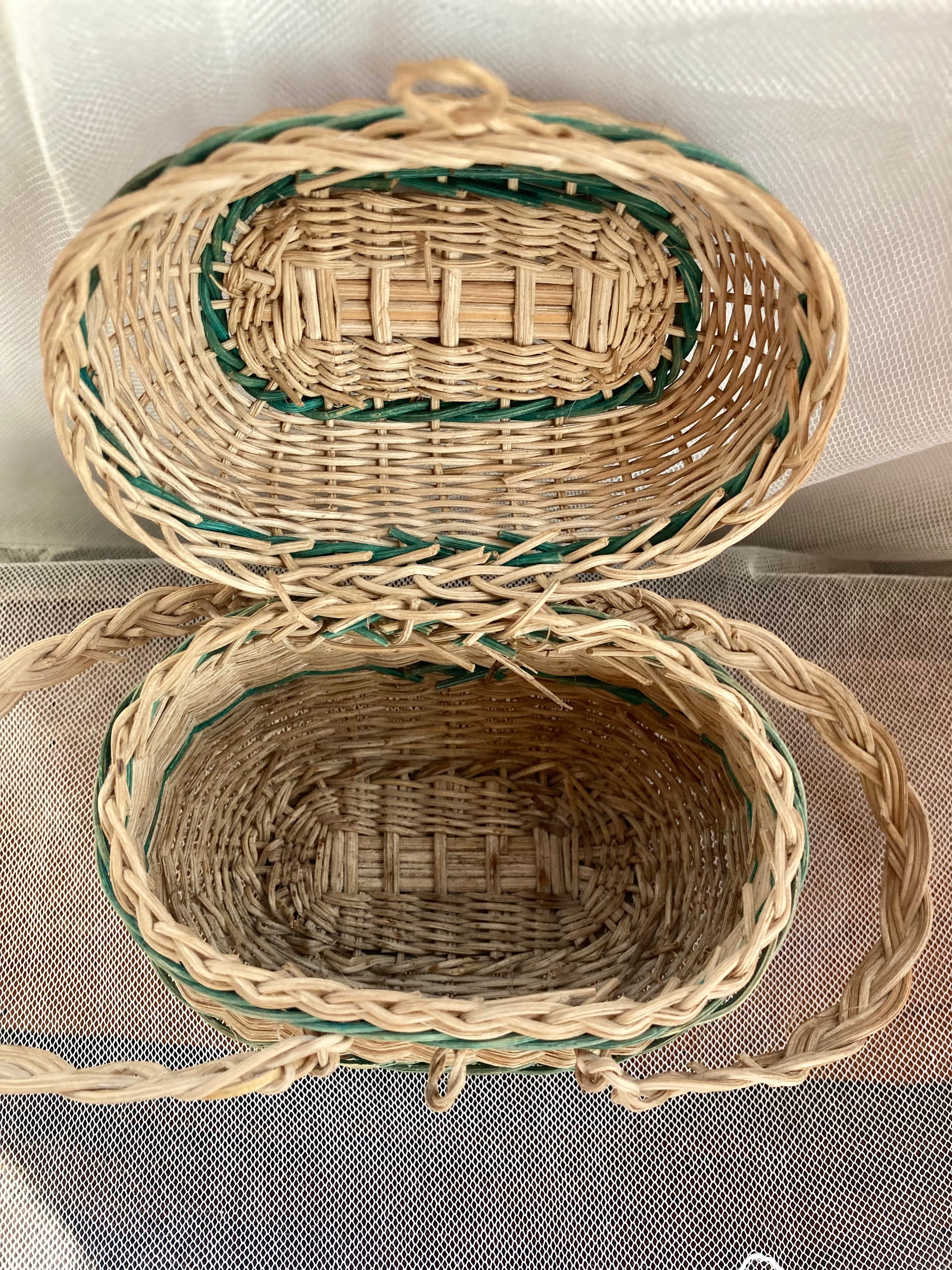 楕円形の蓋やふっくらとしたボディが可愛いドール用のパニエ。丁寧に編まれていて緑色のラインがバランスよく入っているところも素敵です。