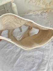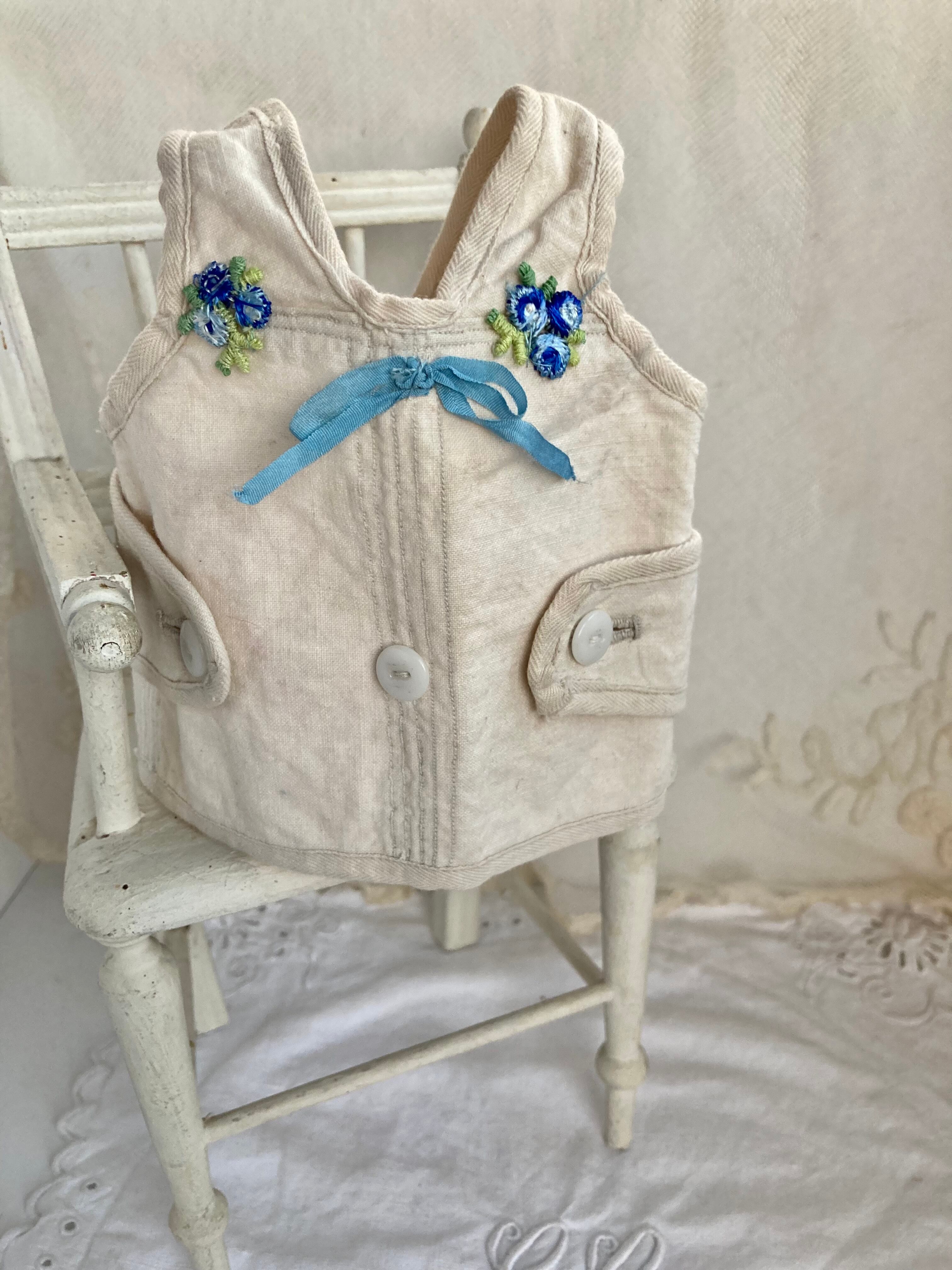 古いものですので汚れはありますが大きなダメージは見当たらず良い状態です。コルセット中央のボタンはズボンが落ちないように留めるためのもので、ちいさなサイズですがとても丁寧に作られています。ドールやぬいぐるみに着せたり甘めなインテリアの飾りにおすすめです。