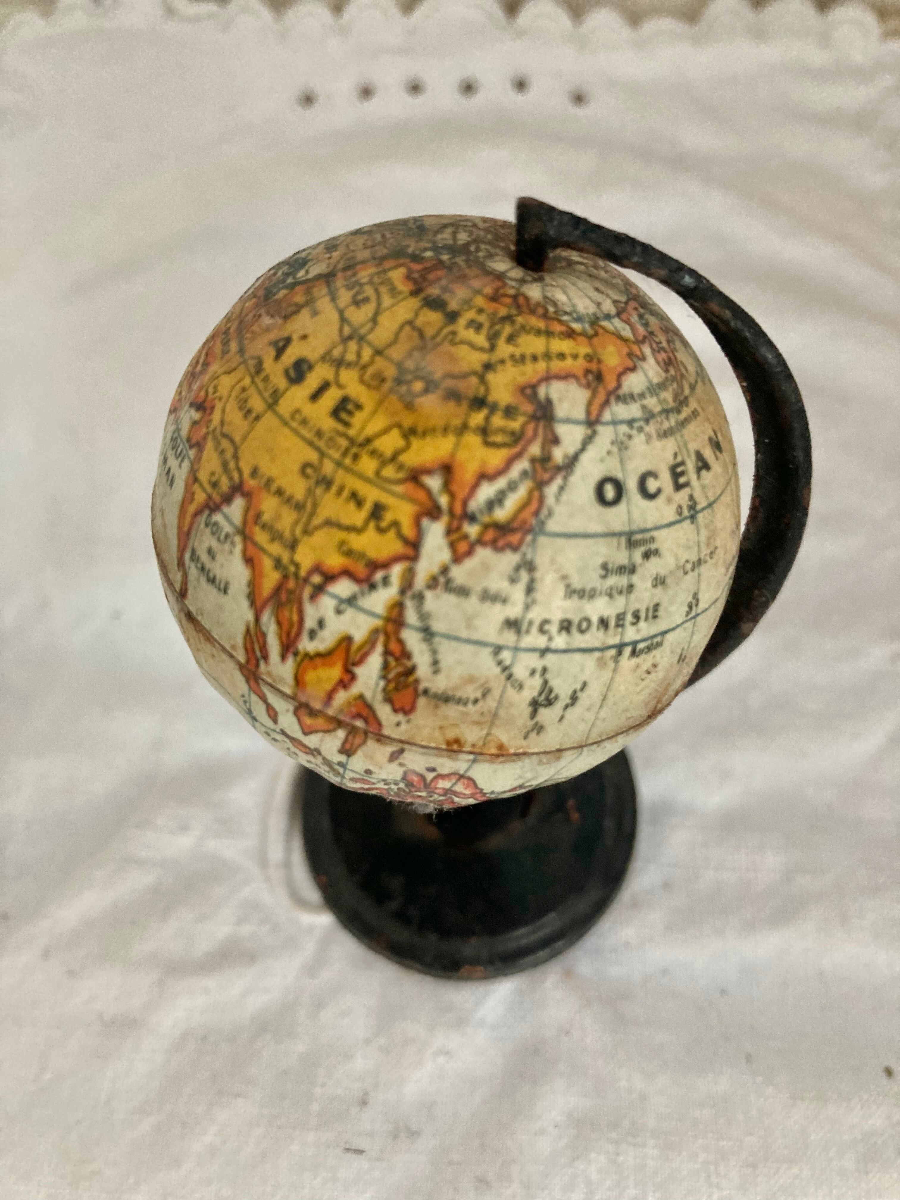 フランスの古いミニチュアの地球儀、とても小さなサイズですがglobeを支える弓と台座が鉄製でミニチュアながら本格的な作りです。台座にサビ、globeにシミや色の滲み、凹凸など経年による劣化はありますが破れなど大きなダメージは見当たりません。