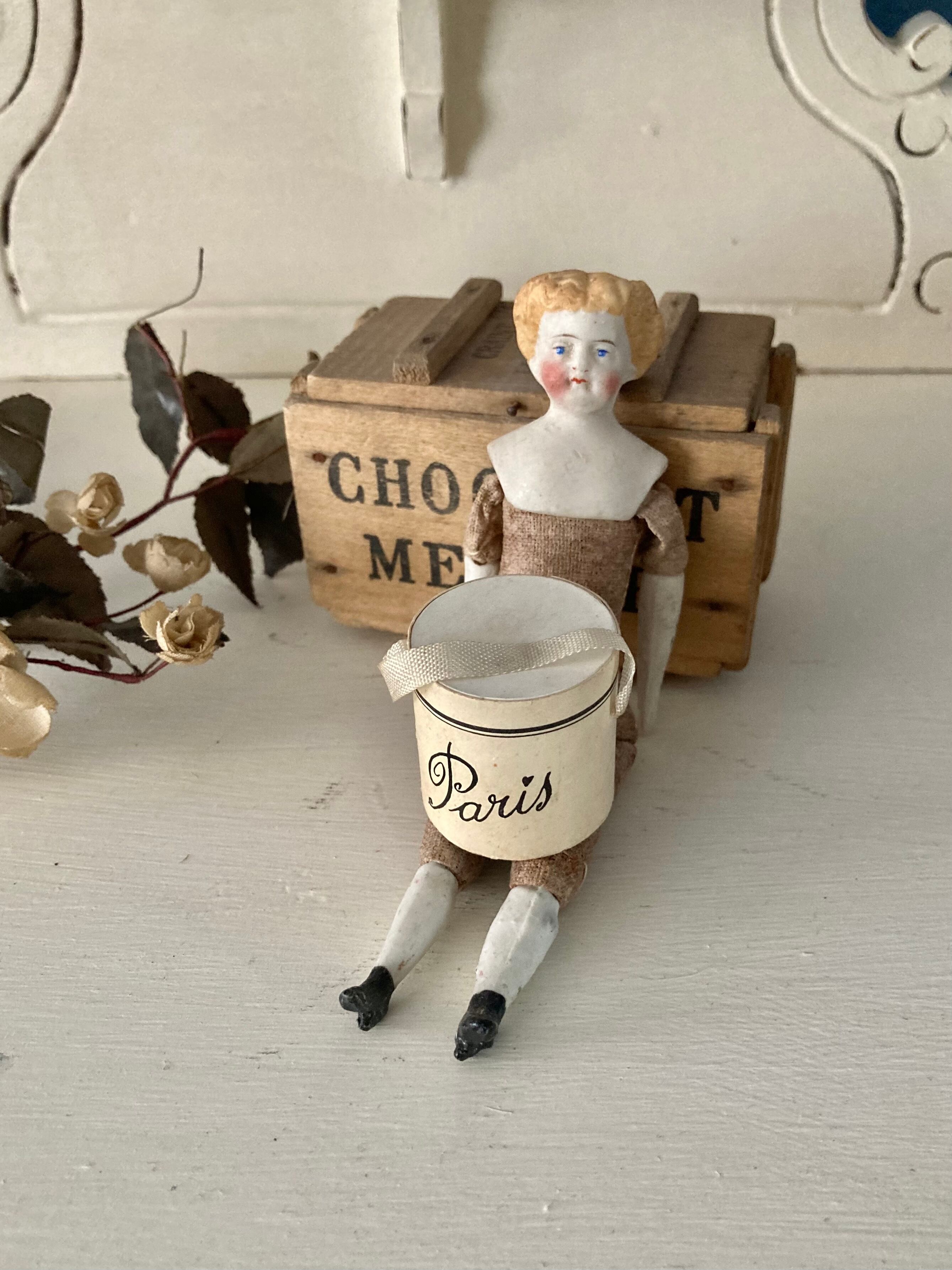 優しい色合いとParisの文字がとても可愛いです。ドールのお供にいかがでしょうか。アンティークショップで買い付けましたが比較的新しい時代のものかもしれません。