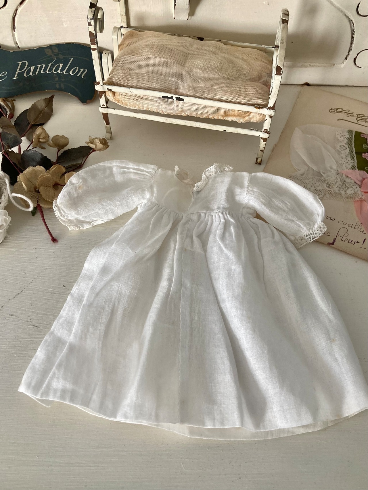 素材はコットンガーゼでとても柔らかく、スカート部分は二重のガーゼになっています。襟元と袖口のトリミングされたレースと胸元のプリーツが可愛いです。