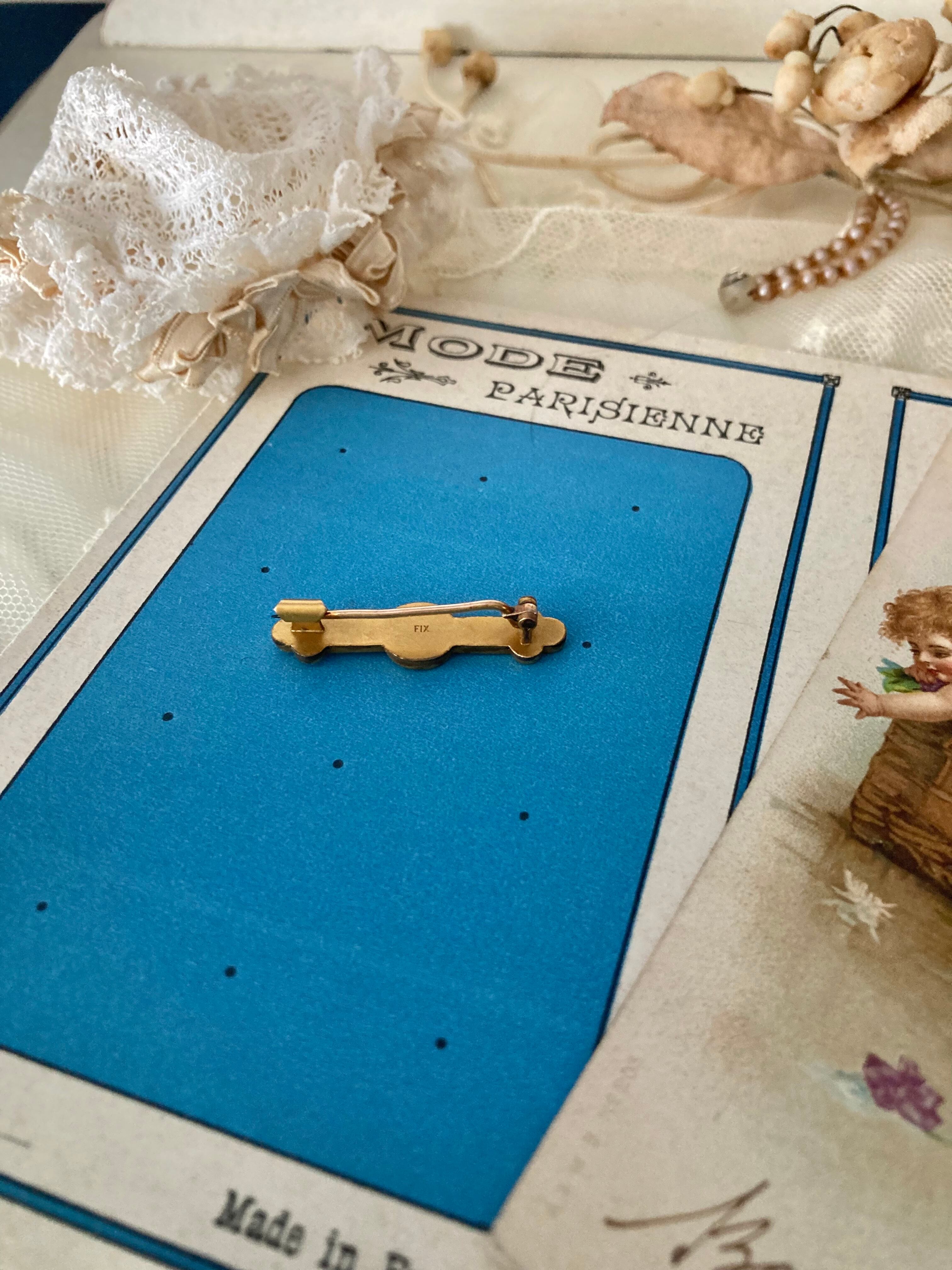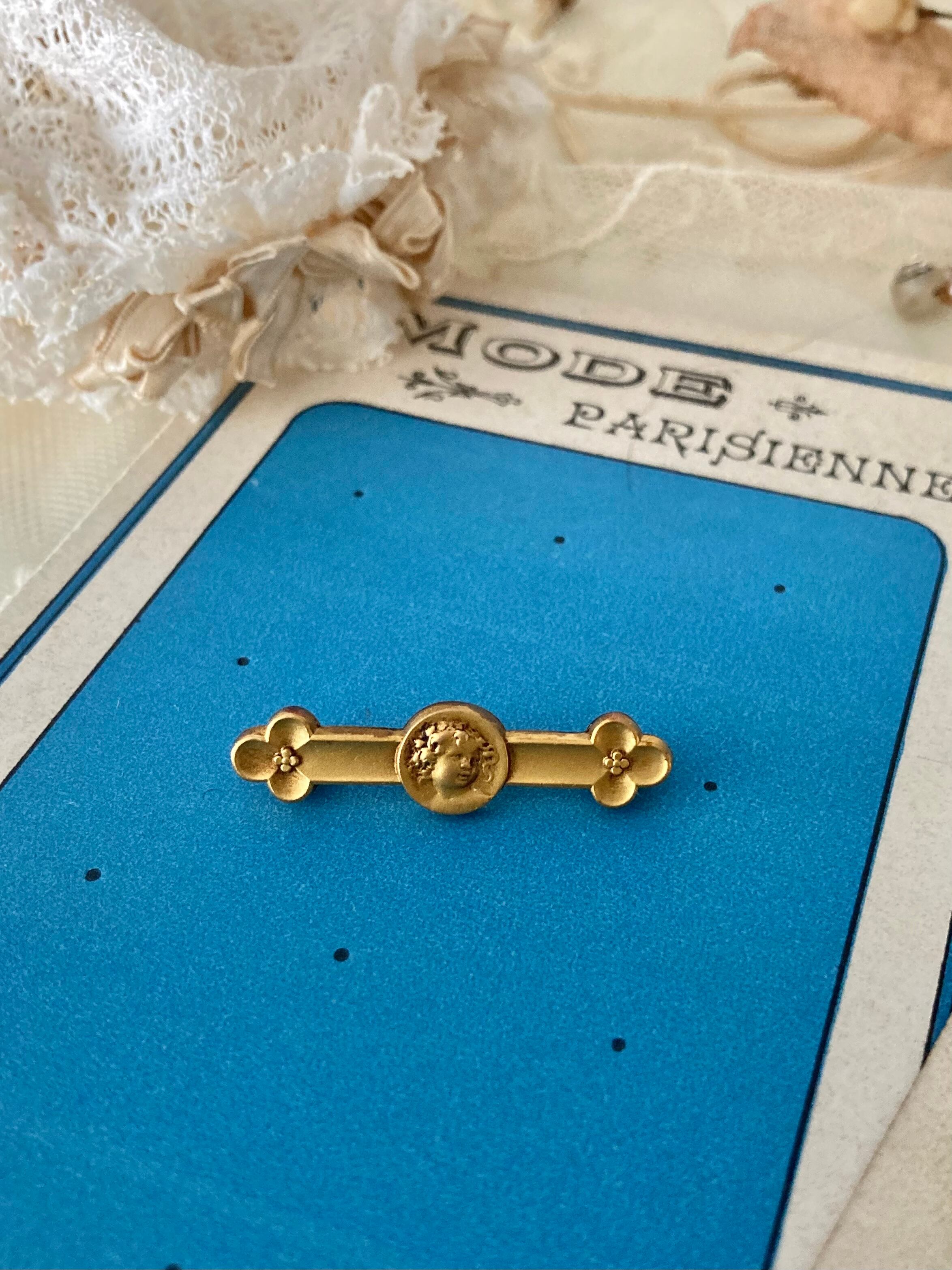 少女のお顔のメダイユを中央にバーの左右にお花模様がデザインされたBébéのブローチ、上下に黒ずみ、針の歪みはありますが、古いものとしては良い状態です。アール・ヌーヴォー期に人気を博したFIX刻印入り。