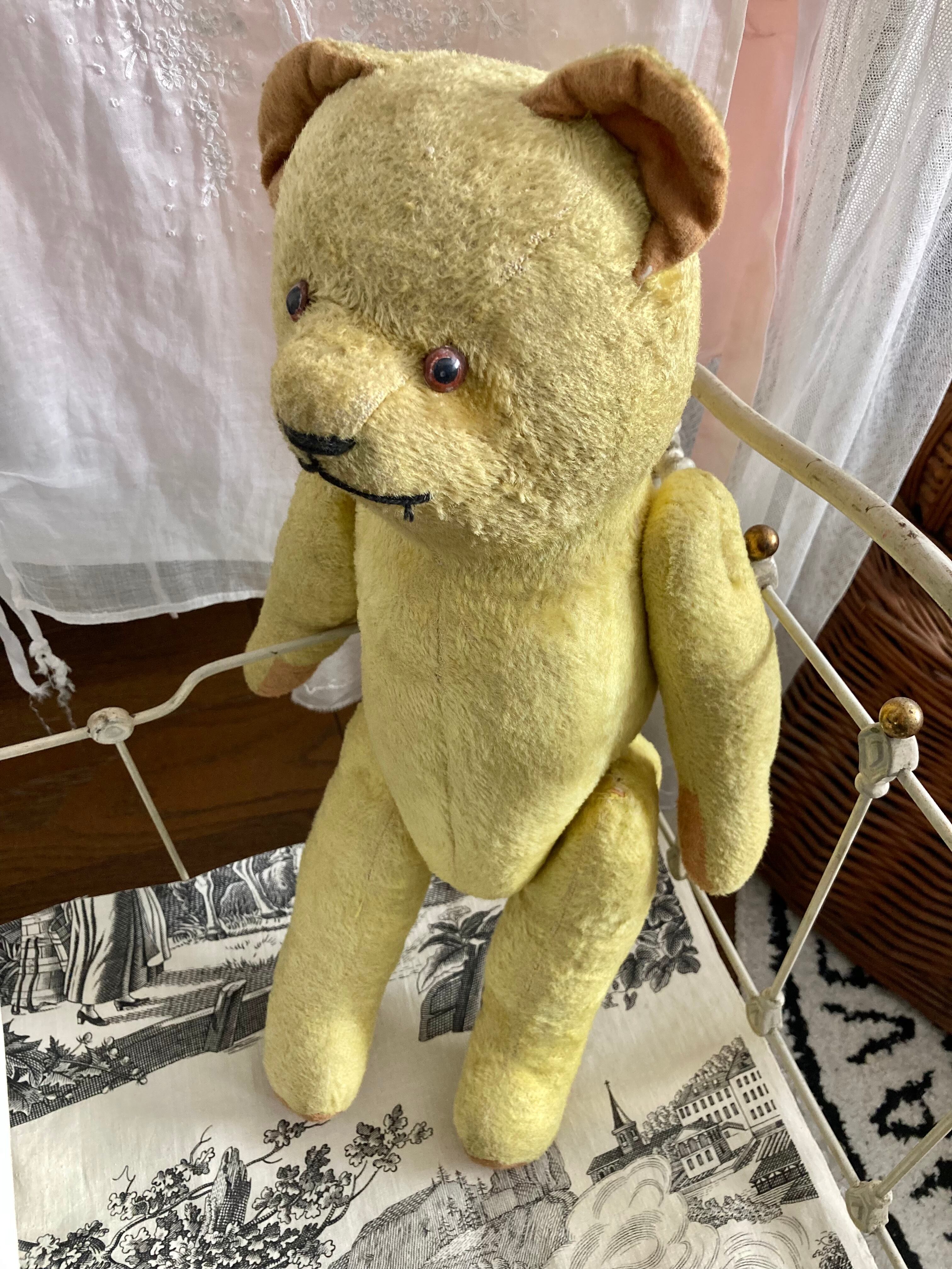 涙を拭ったようなお顔のくまさんです。耳と手足のパッドはベージュ、ボディは全体的に濃い黄色でしっかりと木毛が詰まっています。