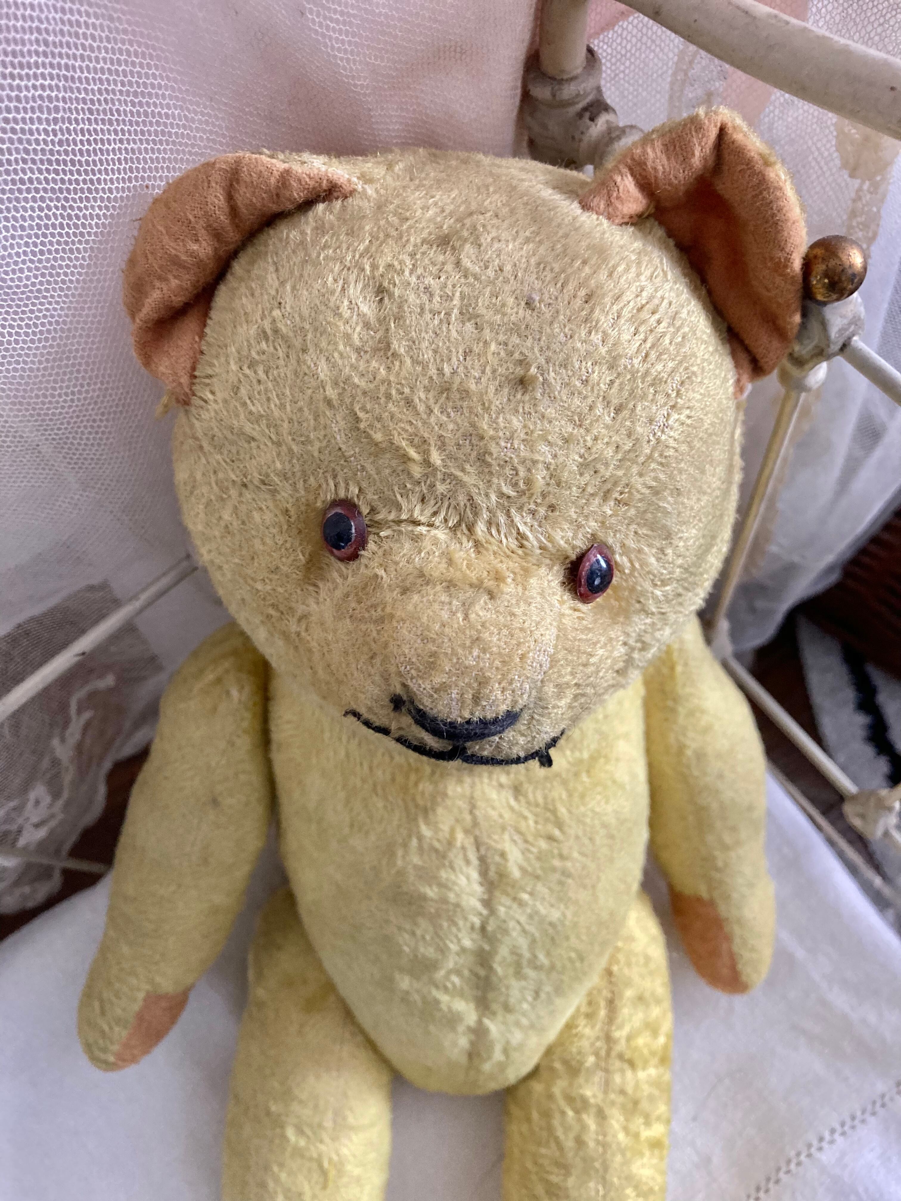所々に汚れ、左側下がった口元に糸が出た箇所、左脚ジョイント部分に少し木毛が見えている箇所(写真最後)と金具の錆、両目に小傷がありますが古いものとしては全体的に良い状態です。