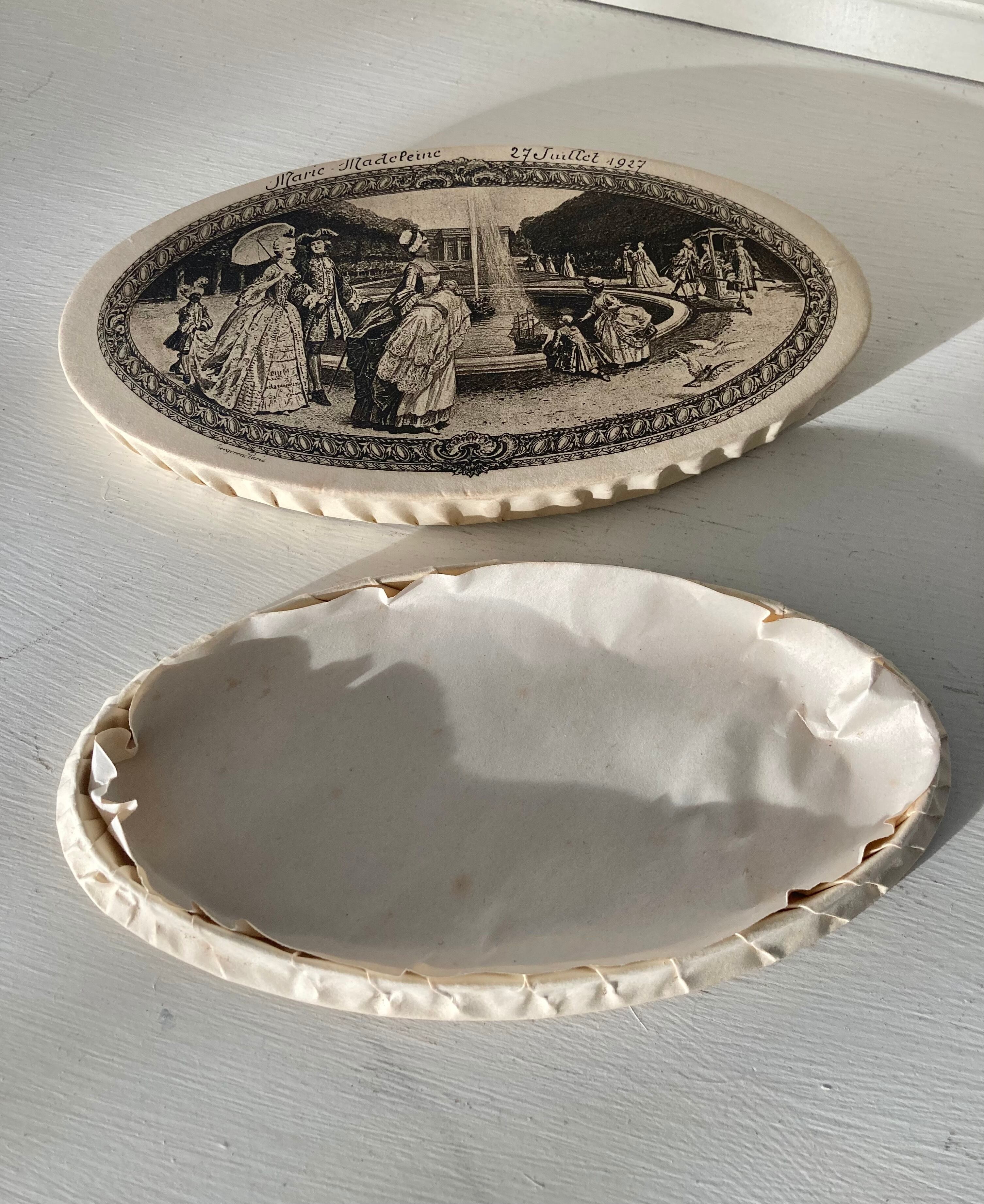 Bébéの誕生を祝うドラジェボックス(お祝いの砂糖菓子が入っていた箱)です。貴族の日常が垣間見えるようなプリント画が美しいです。ごく薄い変色がありますが、破れなどなく全体的にとても良い状態です。