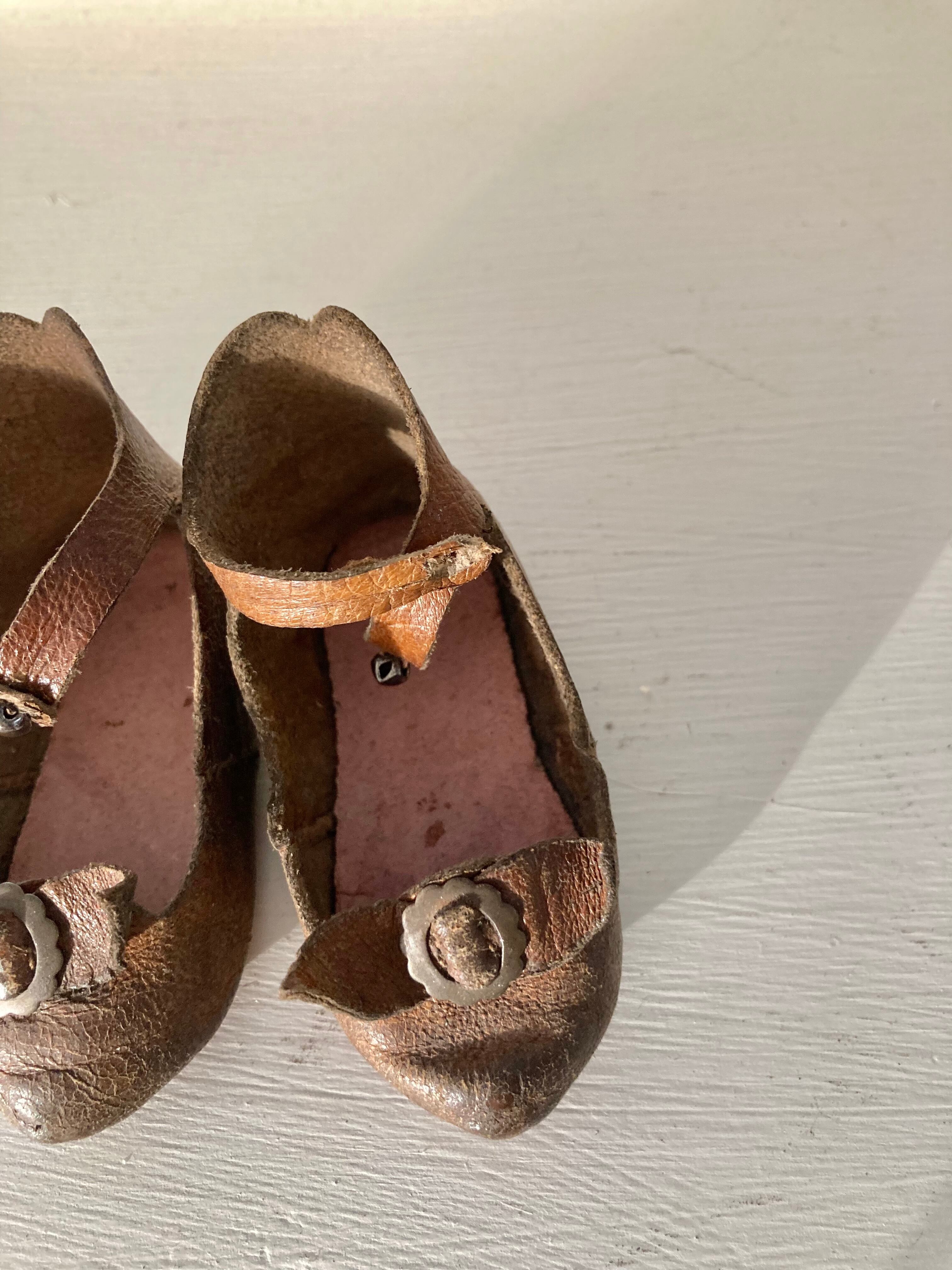 小さなドールシューズ、柔らかいブラウンレザーにバックル金具と中敷のピンク色がとても可愛いです。