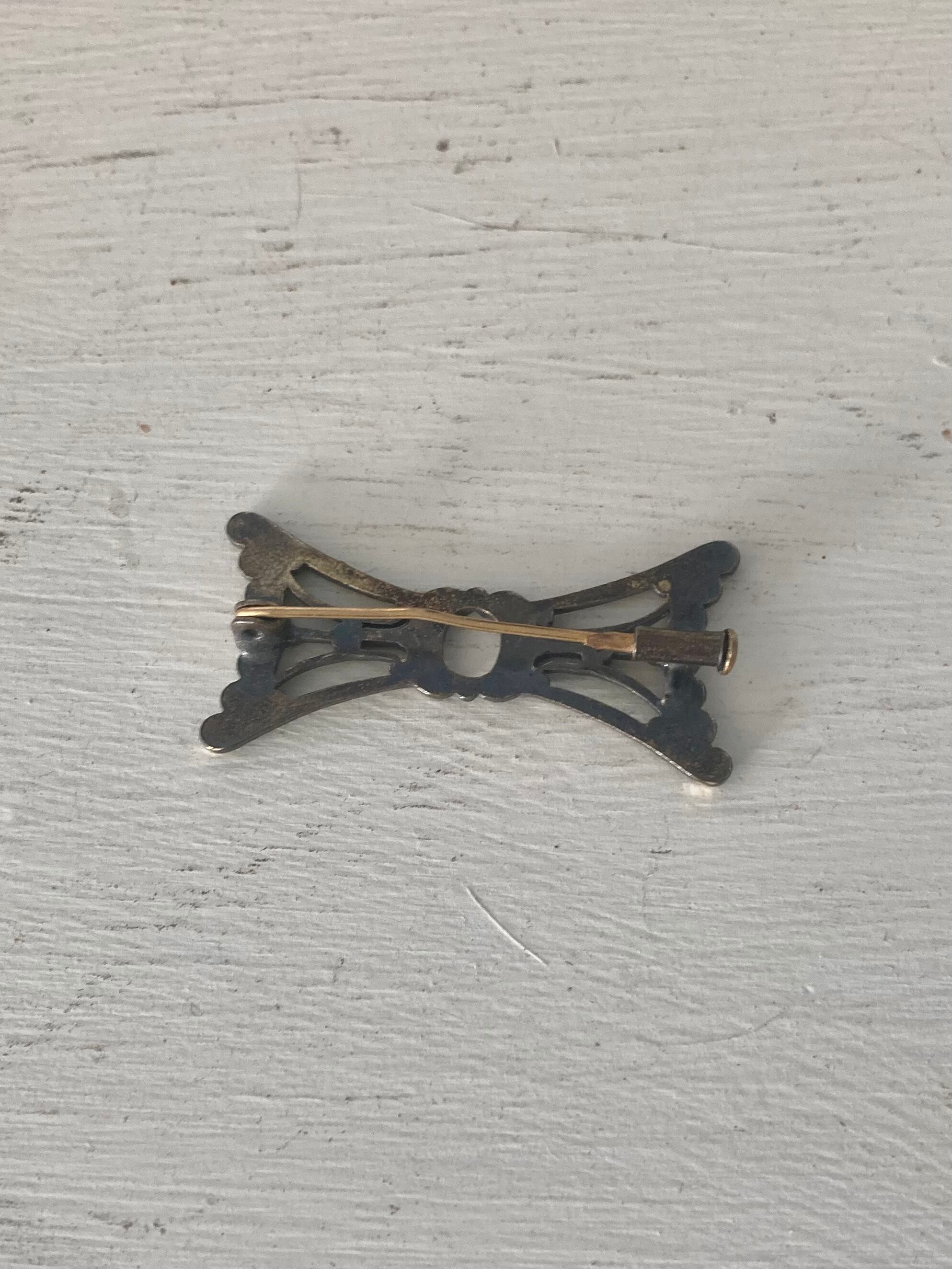 羽ばたく蝶のようなデザインのブローチ、古いもので小傷や変色がありますが埋め込まれたラインストーンは全て揃っています。鉄砲式の針金に歪みが見られますが使用可能な状態です。受け側の金具を引いて針金を差し込んでご使用ください。落下の心配も少ないかと思います。