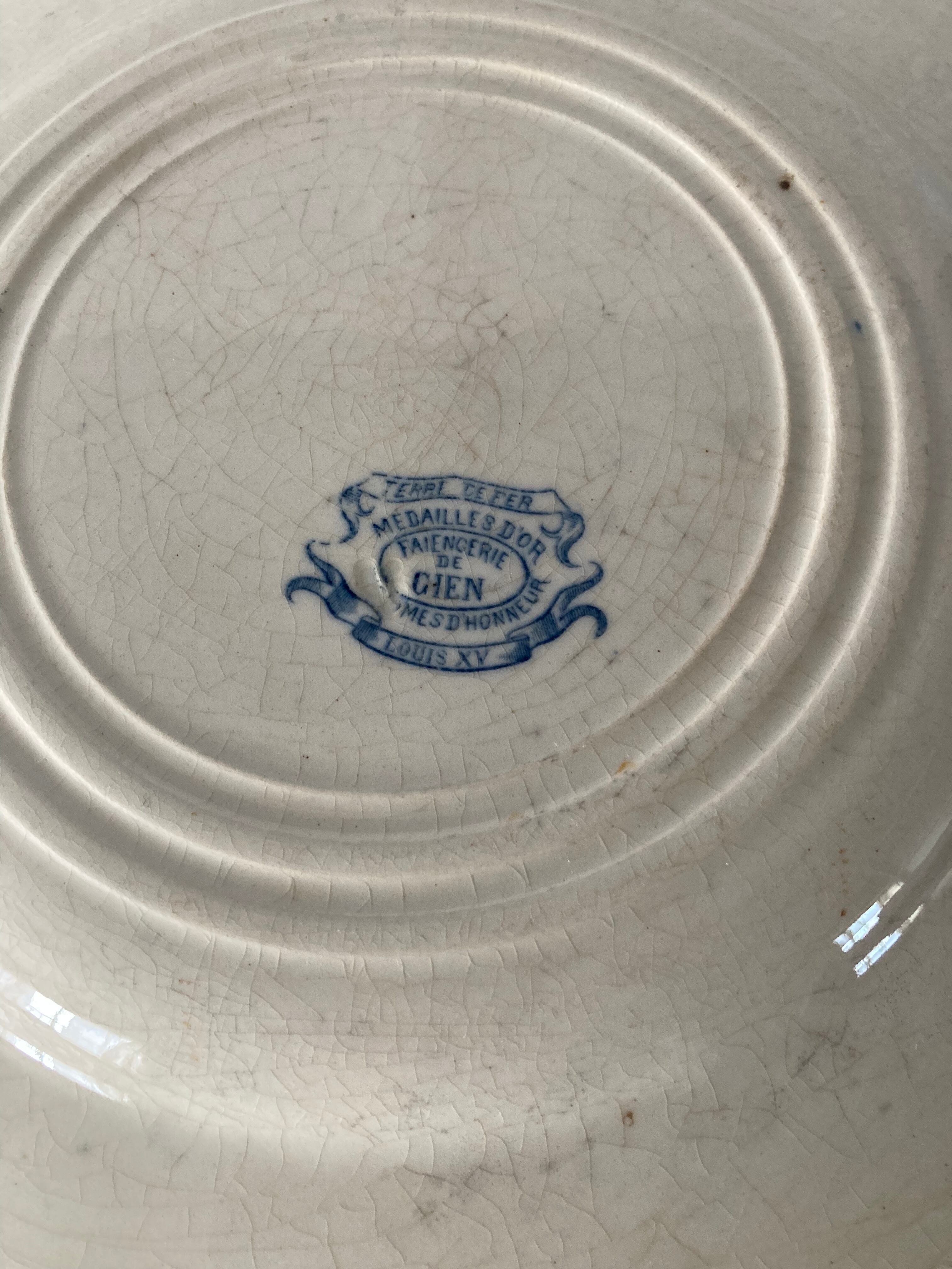 古いもので製造時の凹凸、インク跳ねや全体に貫入がありますが大きなダメージは見当たりません。アカンサス(葉の装飾)を囲むようにブループリントの小花が散りばめられたロマンチックなアンティークプレートです。