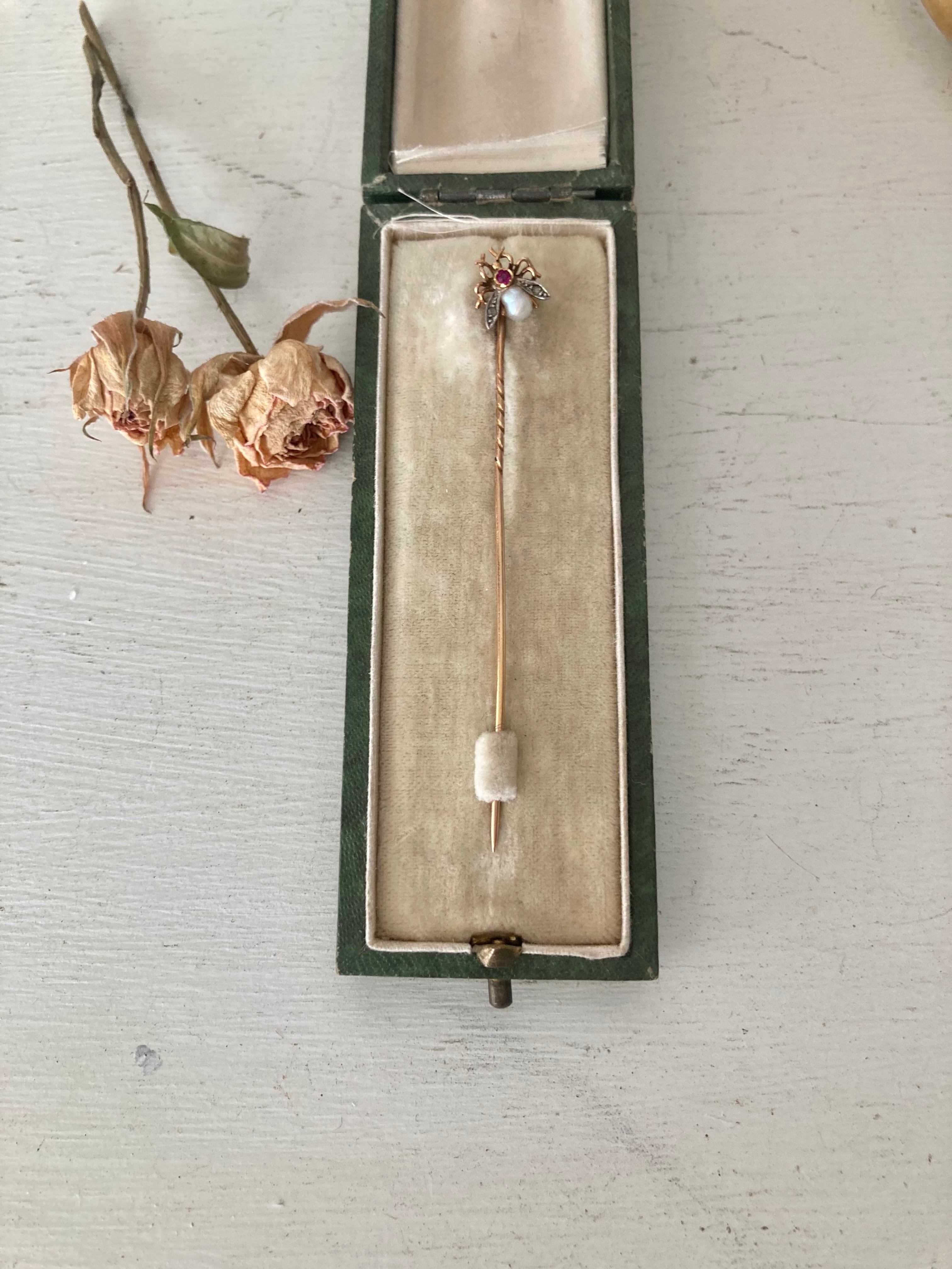 パリで買い付けました蜂のクラヴァットピン(タイピン)です。買い付け時に18Kと聞いていますが刻印は確認出来ていません。羽を広げた蜂の胸部にはルビー、腹部は淡水パールと羽にはペーストガラスがセッティングされています。保証書などは付属しません。