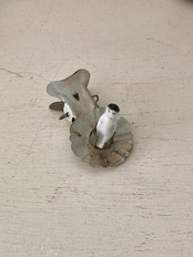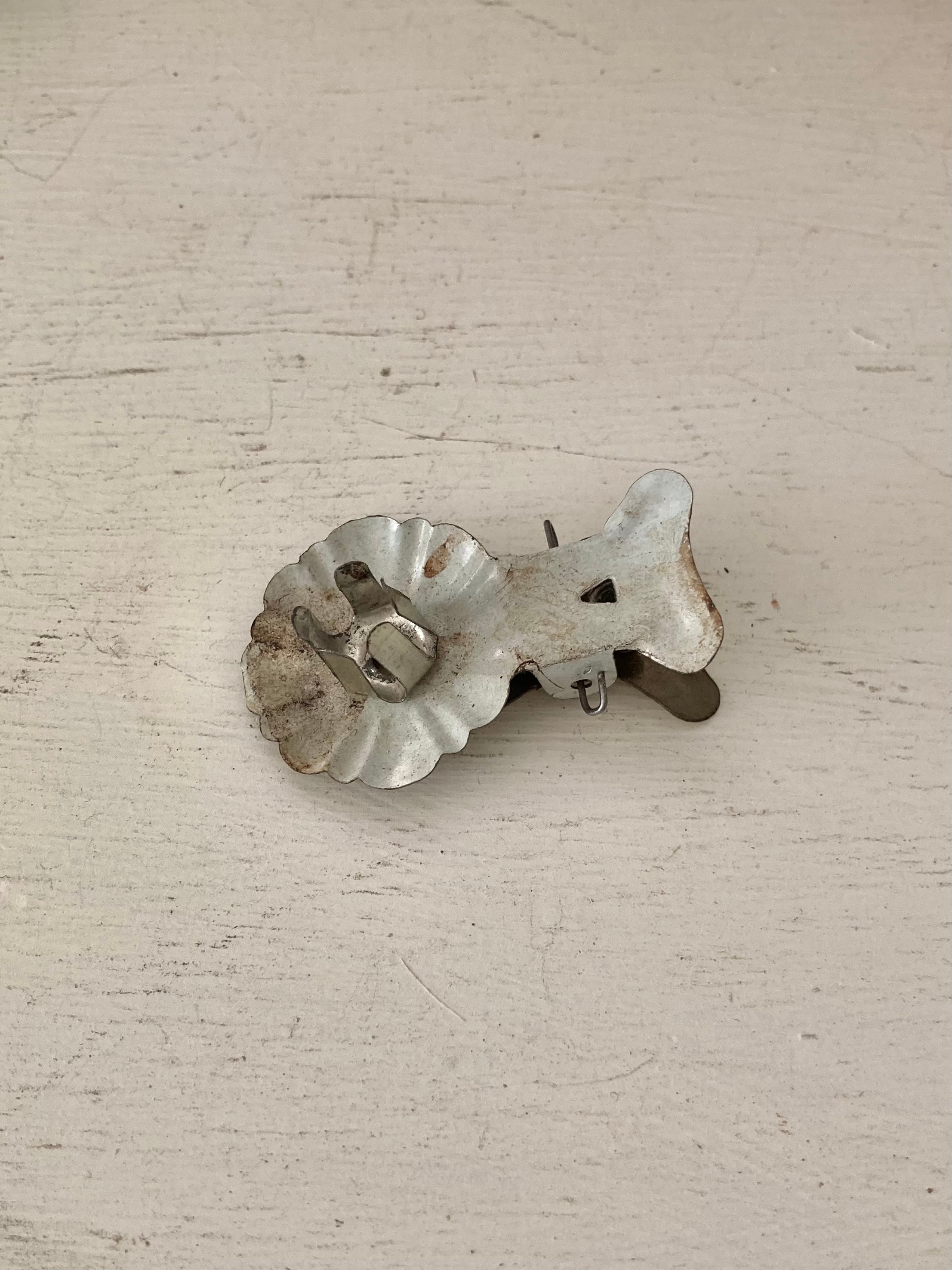 キャンドルスタンドのような形をした小さなクリップです。表側はグレーで裏側は黄色掛かったベージュです。クリップのバネは良好ですがサビや傷があります。