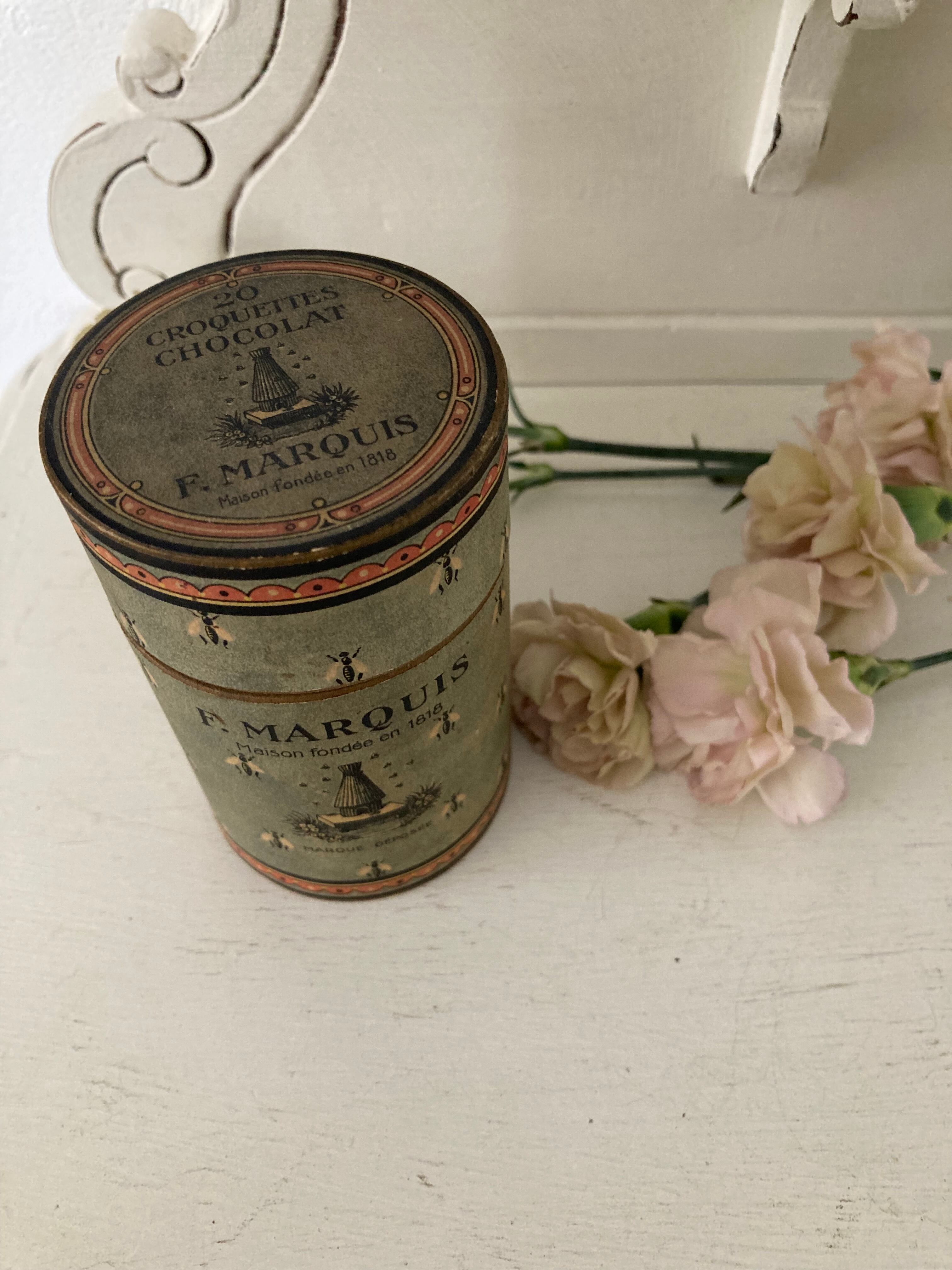 同社製の舌を出した可愛い猫ちゃんのイラスト入りボックスを時折見かけますが、こちらは美しいモーブグリーンの円形縦長ボックスにプリントされた蜂のイラストがとてもアンティークらしい雰囲気で、1818年にパリのパサージュ デ パノラマにお店を構えた住所59,Passage des Panoramasが印刷されています。パサージュ デ パノラマは現代でも古い時代の雰囲気が残る素敵なパサージュ(屋根付きのアーケード)です。当時から木製のファサード、床、大理石で豪華に装飾された店内だったようです。