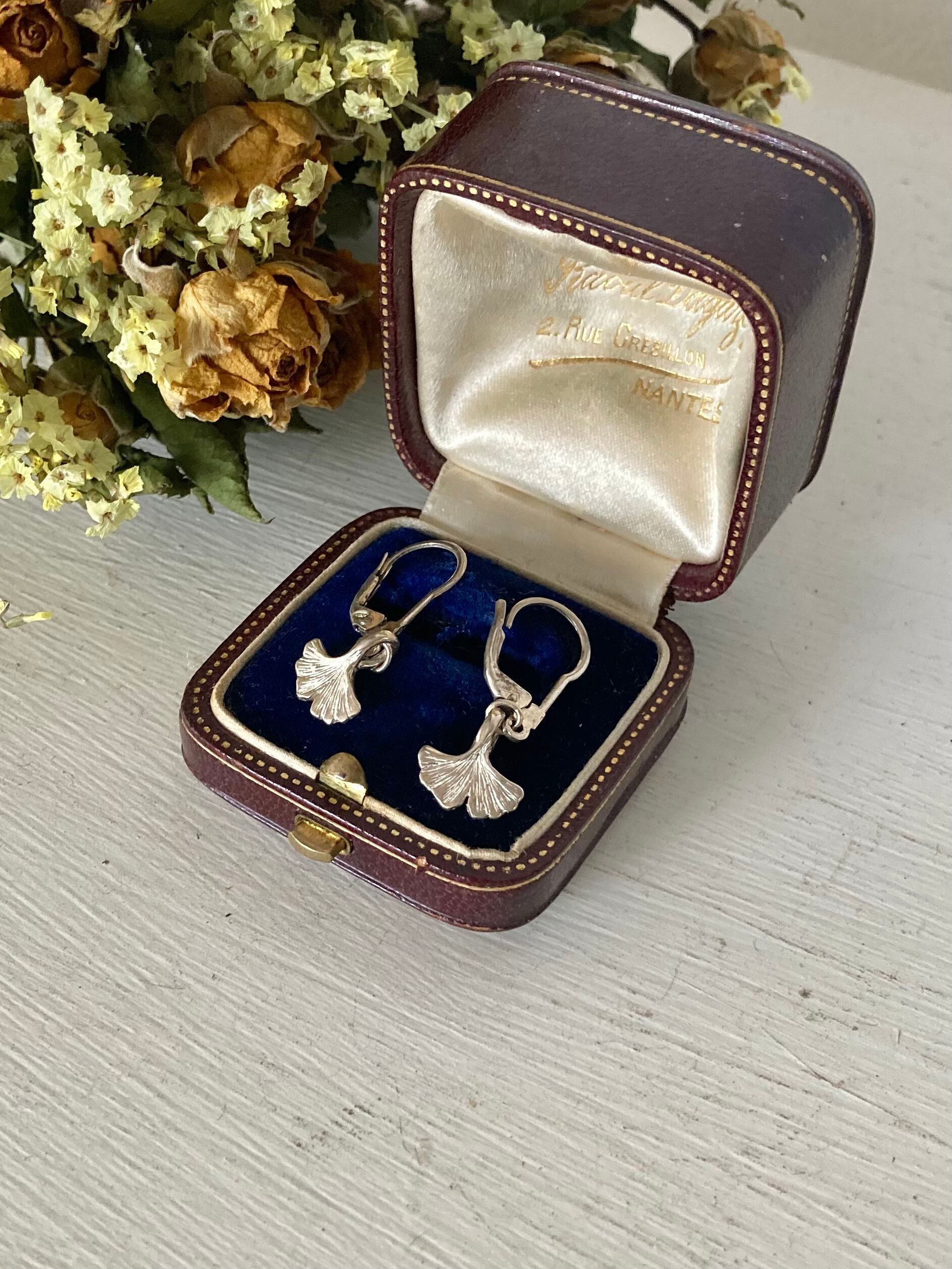 イチョウの葉が耳元でゆらゆらと動くヴィンテージのフープピアスです。1.2cmほどの小さな葉には葉脈もあり揺れるとキラキラ光って見えます。裏側にシルバー925の刻印、軽く着脱もスムーズです。