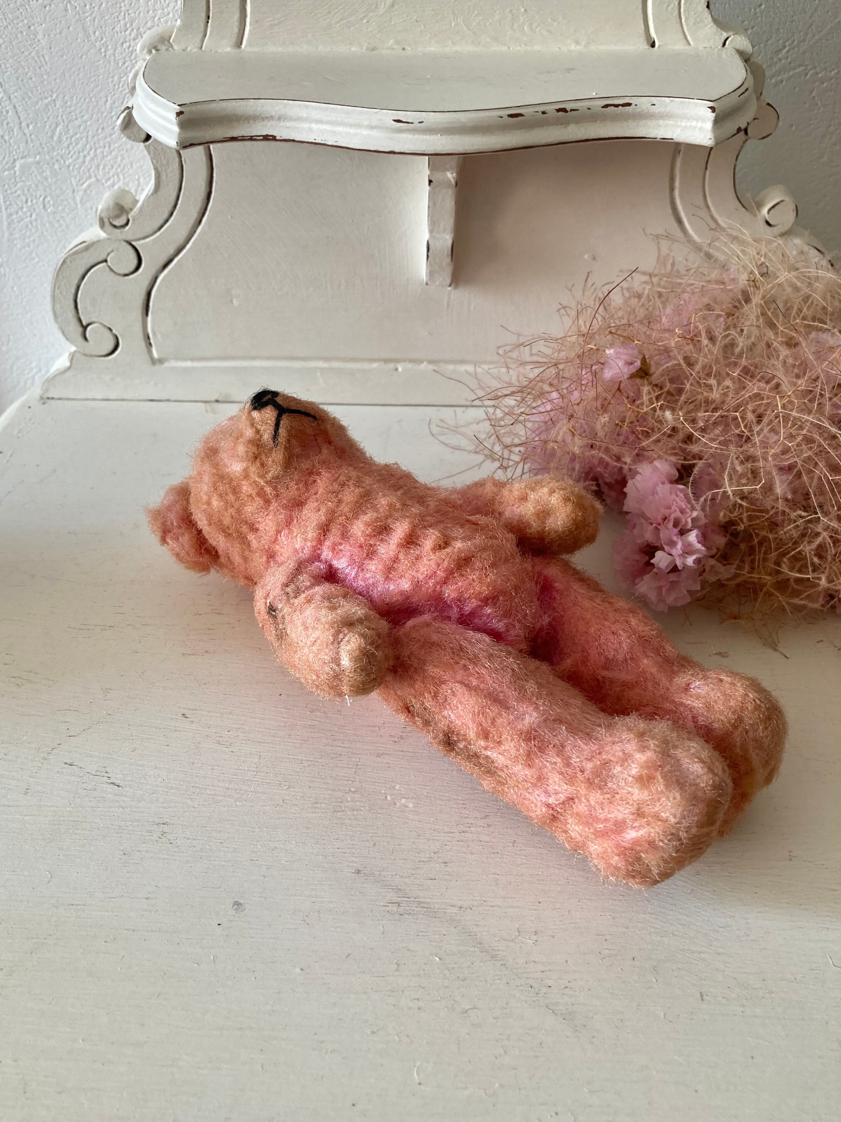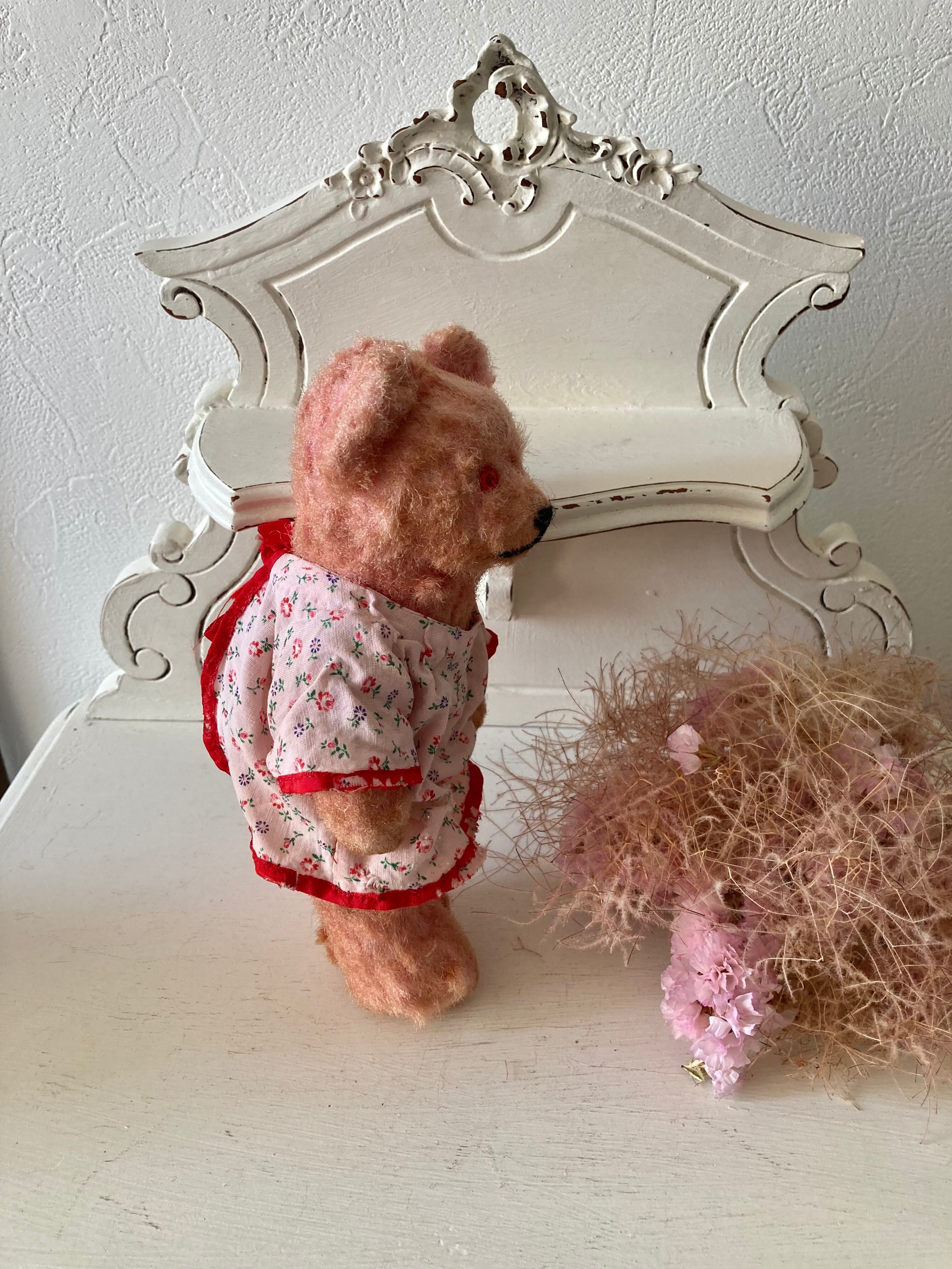 ピンク色の綿菓子のようやビビットなボディカラーのベア、古いものでお口周り(写真5)やボディ(写真16、17)にモヘアロスや汚れとジョイント金具にサビがありますが、同じくピンク色の花柄スモッグを着ていてとても可愛いです。お洋服にも経年によるダメージ(小さなホール、袖口や裾の擦り切れなど)はありますがおそらくオリジナルの衣装でとても似合っています。ハンドメイドのエプロンやお洋服を着せてあげてもいいですね。