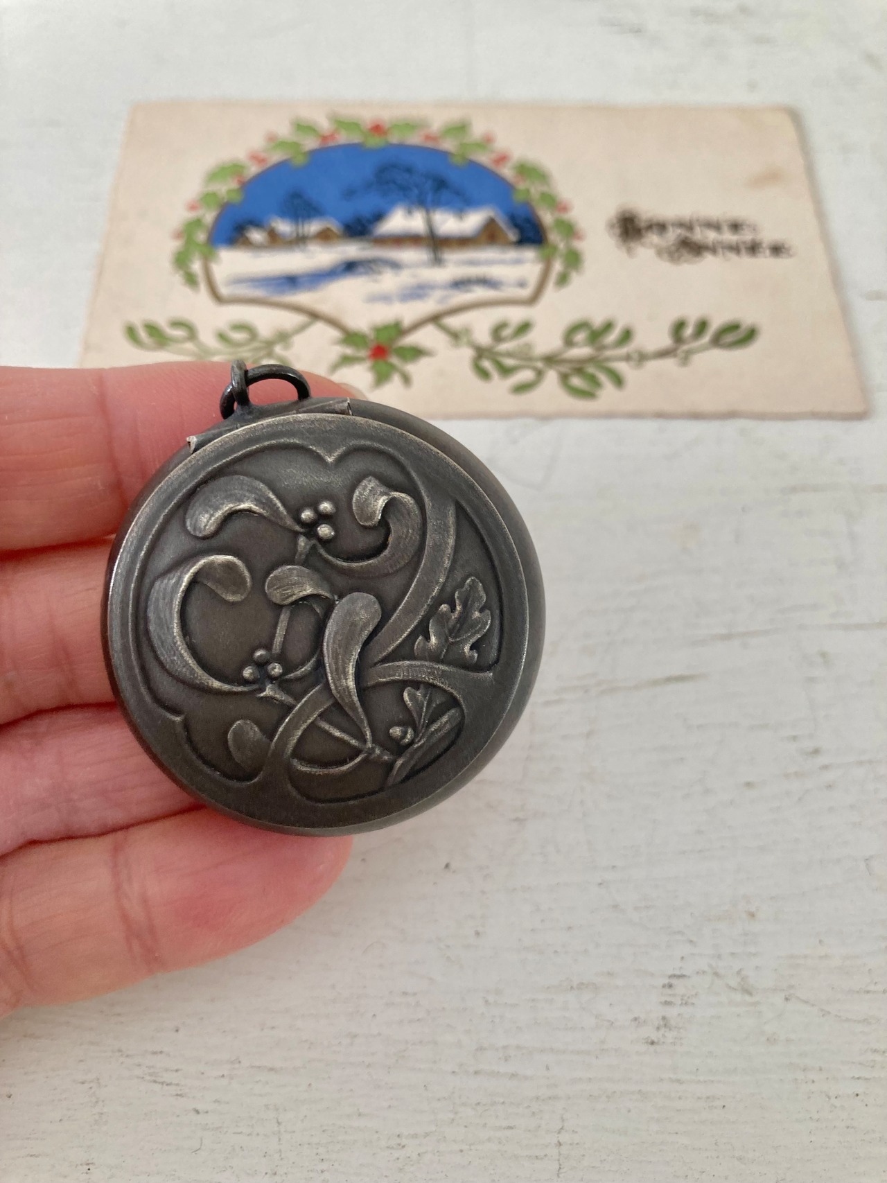 パリの蚤の市で出会ったヤドリギのパウダーケースです。全体的に黒ずみ、底にはすり傷があり、内側ミラー縁のゴールドカラーには剥がれ(写真5、6)があります。ミラーは小傷はありますが使用可能な状態です。丸カン付き