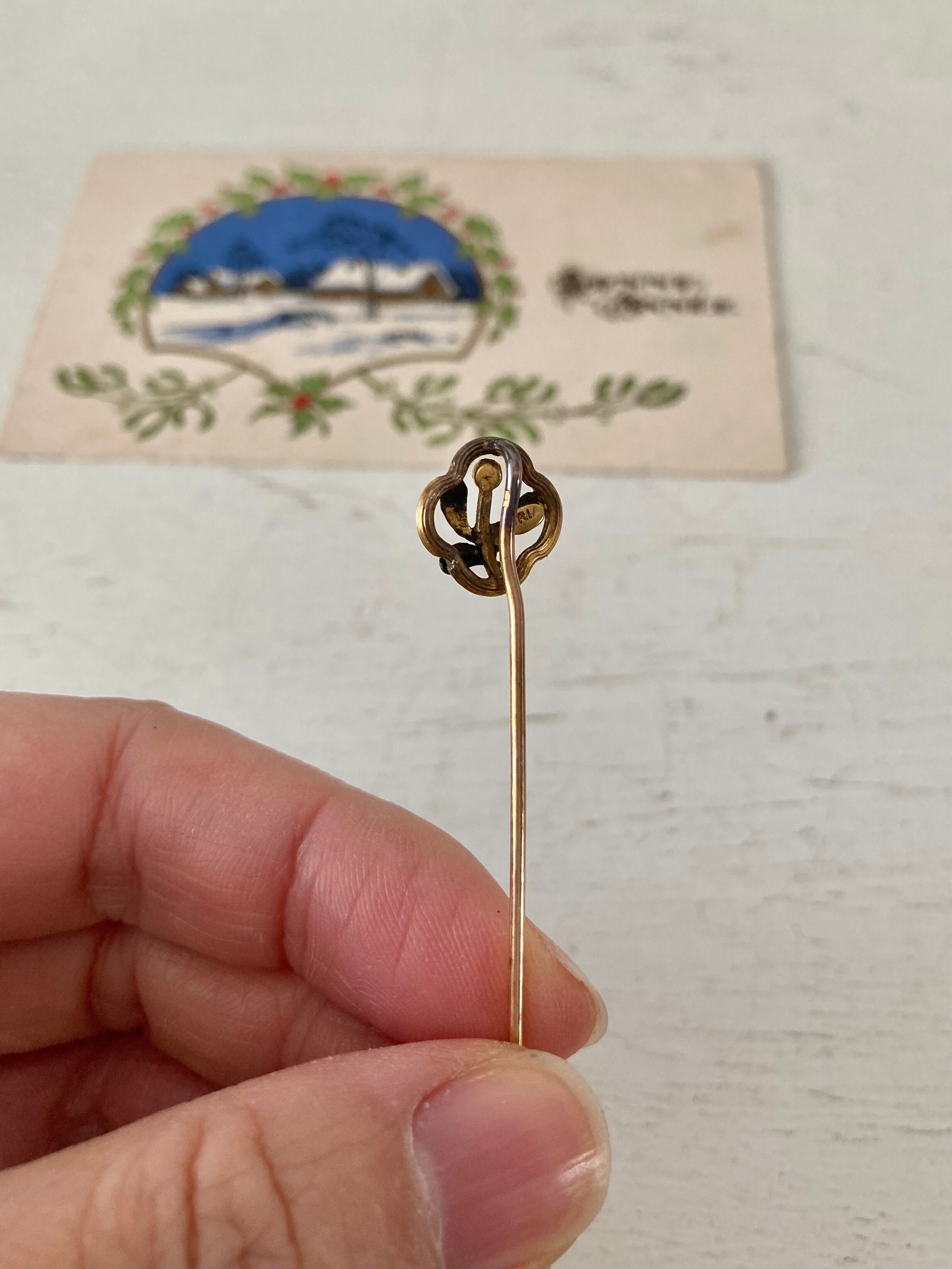 ヤドリギモチーフ、ゴールドプレートのハットピンです。トップのヤドリギの実はイミテーションパールです。葉の部分には細かな模様が入っていてフレーム部分とツートンカラーのように見えます。
