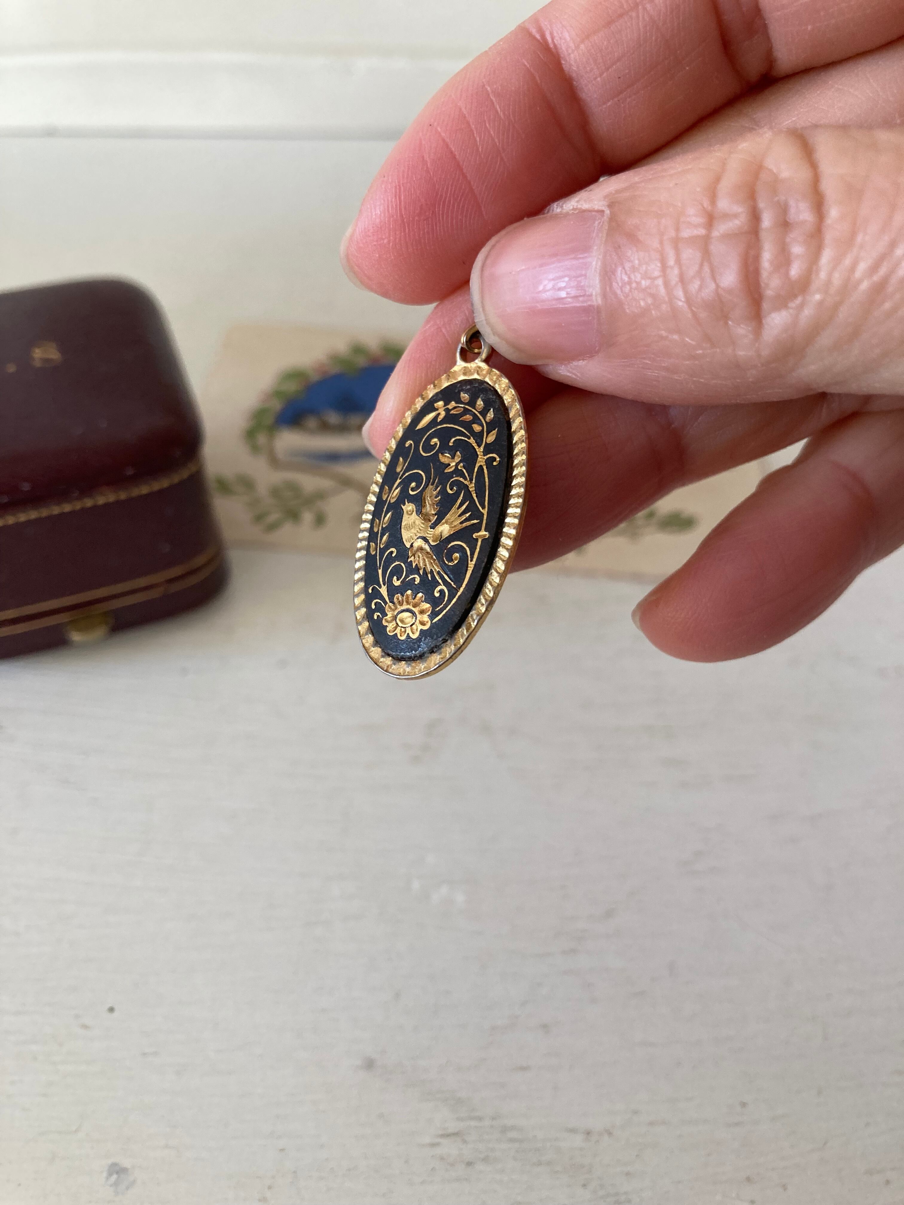ノワールを背景に草花に囲まれ輝く一羽の鳥、環を繋ぐ金具部分と表面のゴールドメッキに経年による痛みはありますが目立つダメージはなく実用は可能です。