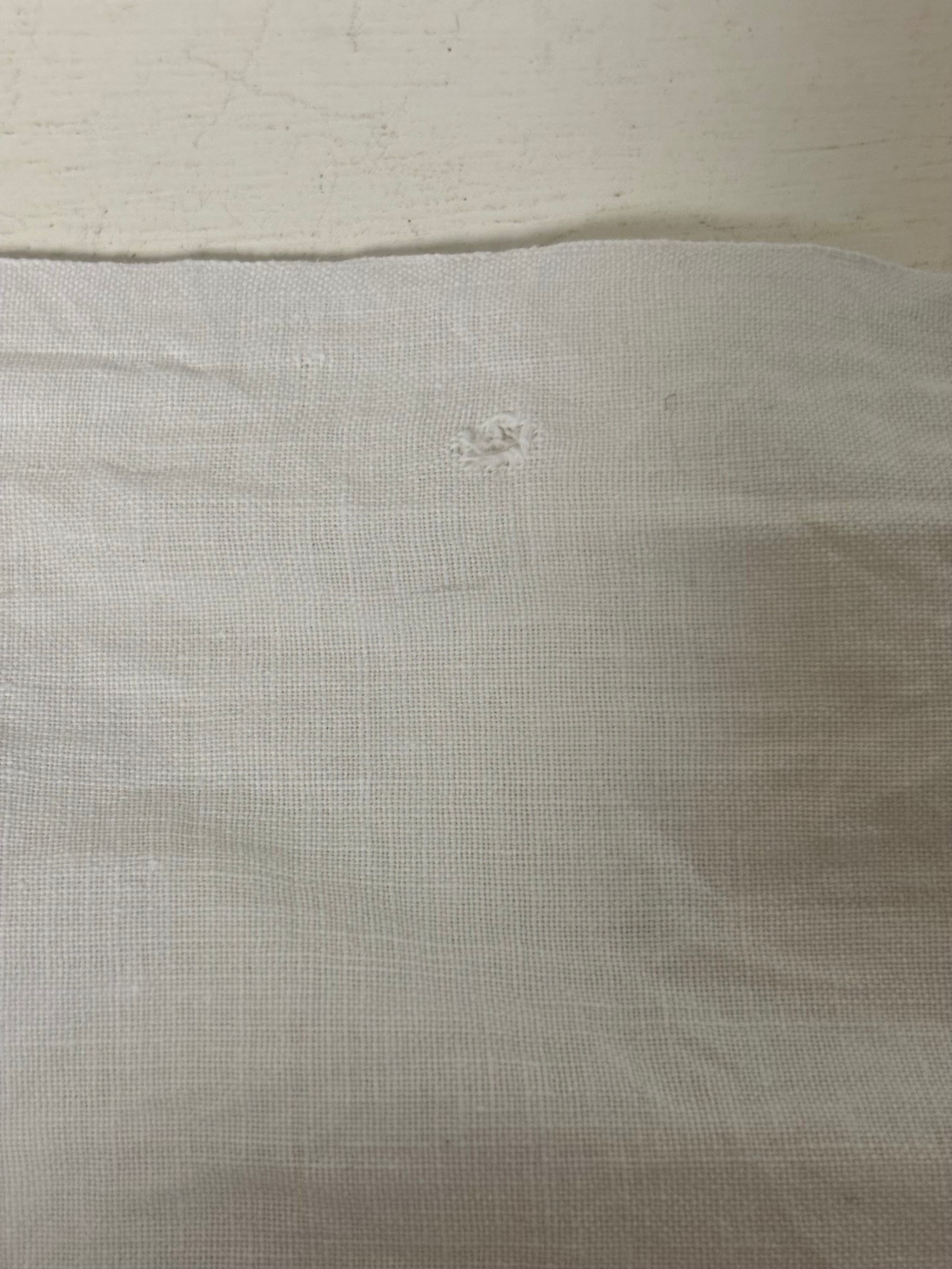 コットンにシミや汚れと糸切れやホツレ、3ミリ角ほどの破れ2箇所と一部白い刺繍糸を使っている箇所があります。また右端は処理されておらず切りっぱなしの状態です。古いもので難はありますが棚の中などに飾ってお楽しみ頂けると思います。