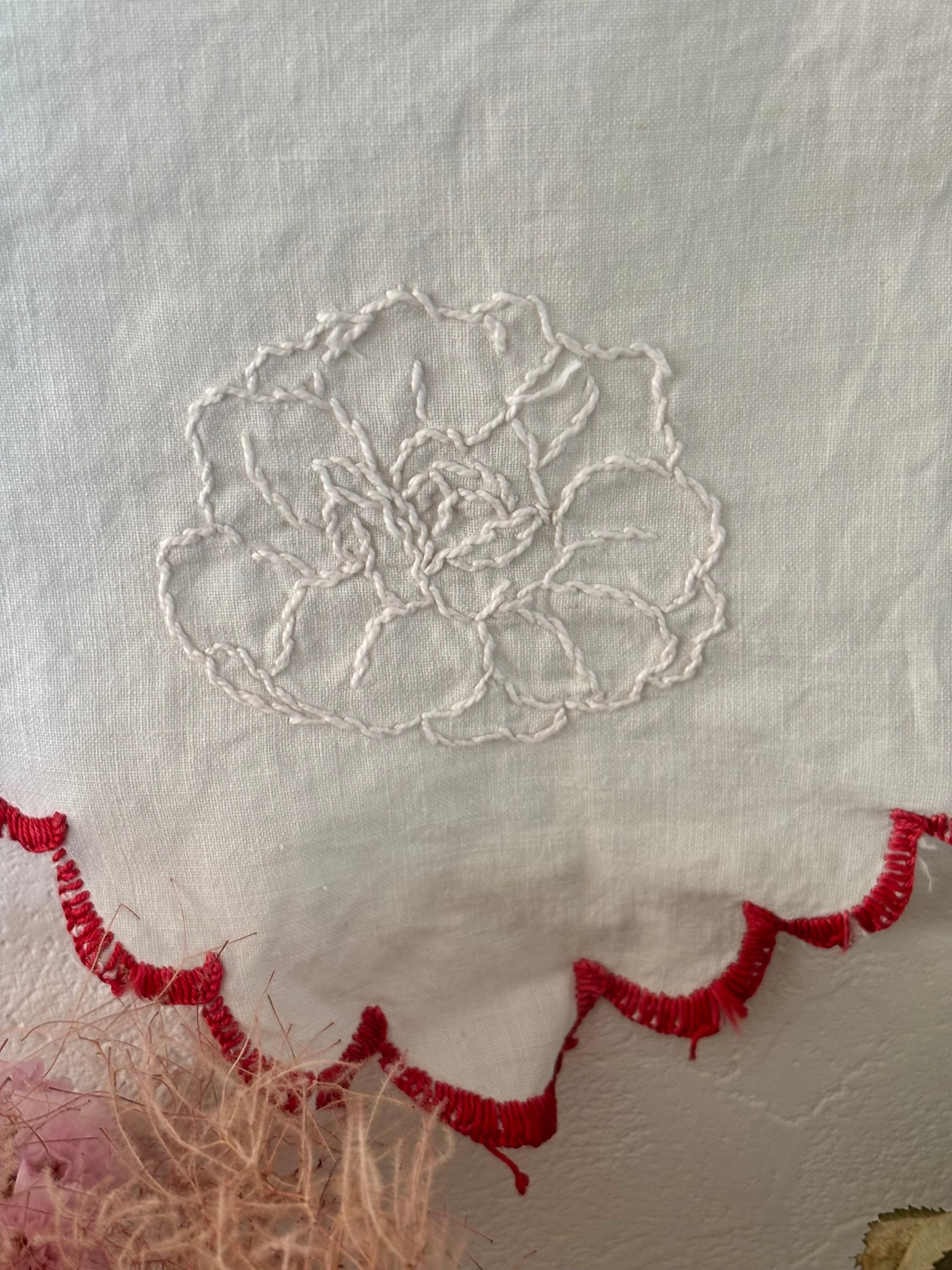赤ちゃんをあやすお母さんやお料理をする女性が刺繍されたボーダータペストリーです。赤で刺繍された絵柄がとても可愛いらしく裾も同じく赤い糸でスカラップ刺繍されています。