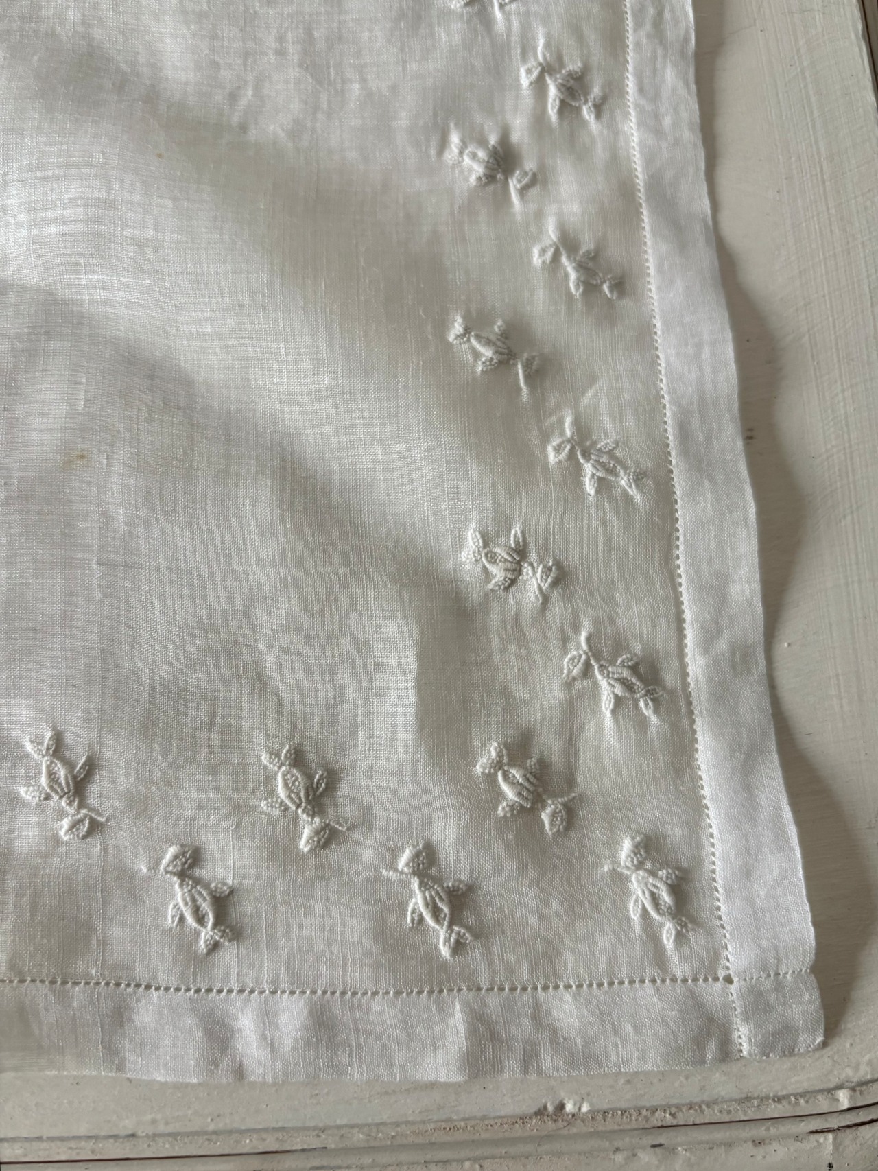 透け感のある柔らかなコットンローン地にイニシャルモノグラムと植物の蕾のような刺繍が縁周りに施された繊細で美しいムショワールです。